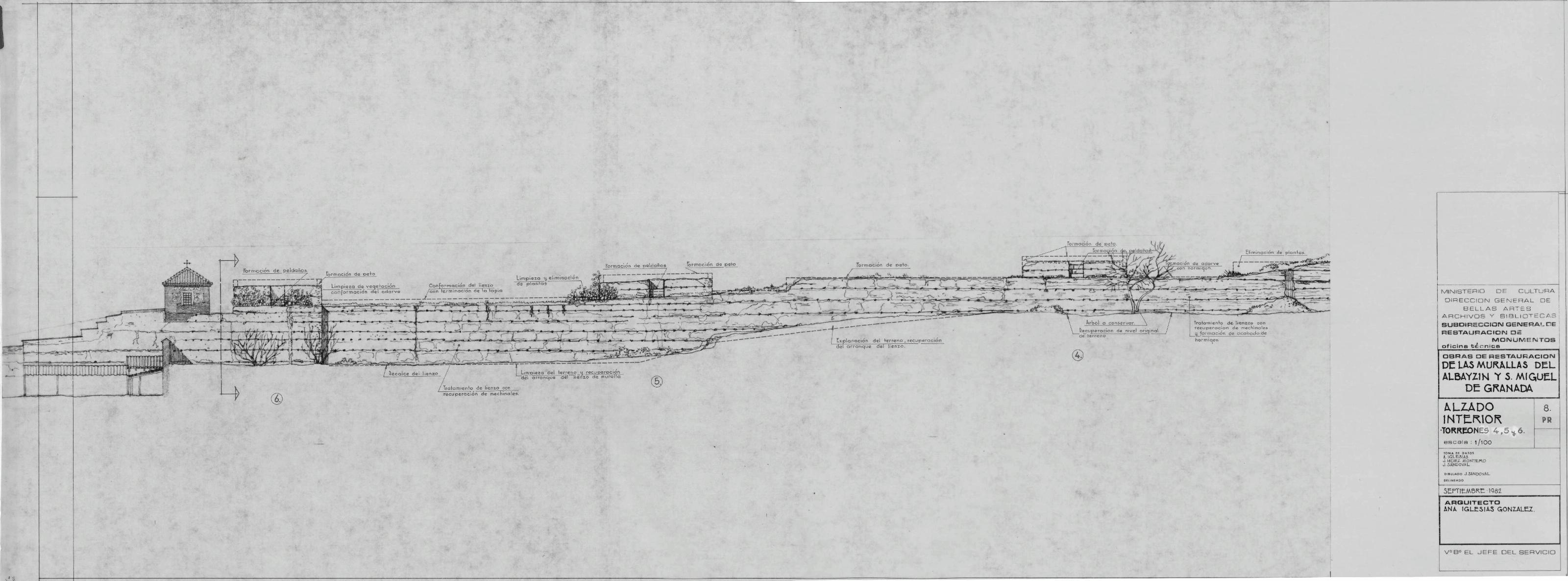 MURALLAS DEL ALBAYCIN Y SAN MIGUEL.- GRANADA-: ALZADO INTERIOR, TORREONES 4, 5,, Y 6 En este plano tenemos dibujados, las actuaciones a realizar.como: Formacion de peto, eliminacion de plantas, Excavacion hasta arranque de muralla, y limpieza general del paramento... plano sin acotar.