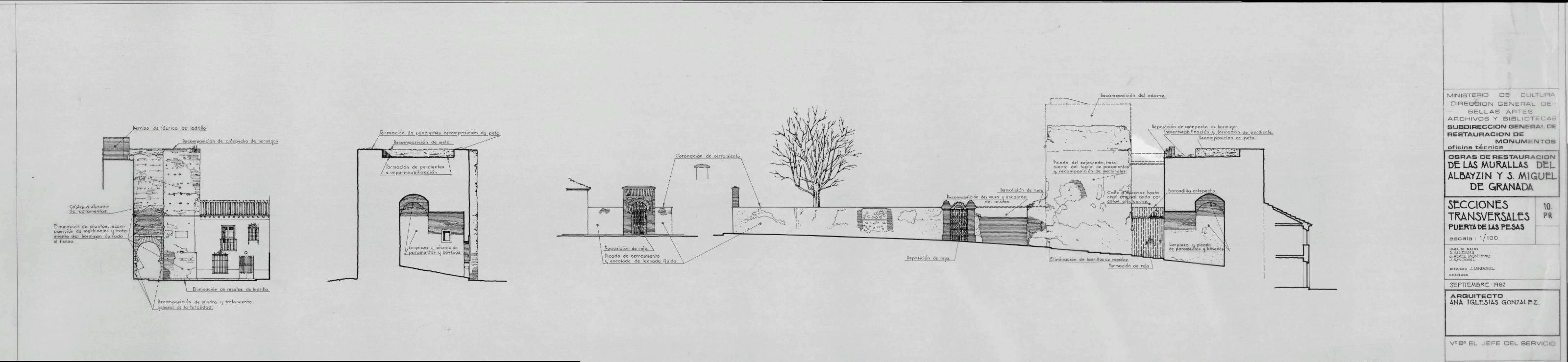 MURALLAS DEL ALBAYCIN Y SAN MIGUEL.- GRANADA-: SECCIONES TRANSVERSALES, PUERTA DE LAS PESAS En este plano tenemos dibujados, las actuaciones a realizar.como: Formacion de peto, eliminacion de plantas, Reposicion de reja, demolicion de muro, limpieza general del paramento... plano sin acotar.