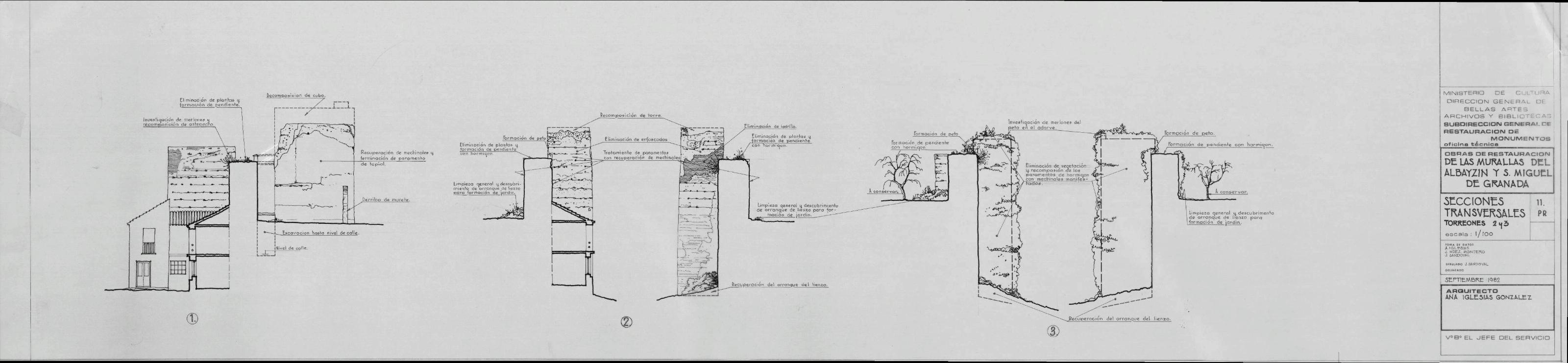 MURALLAS DEL ALBAYCIN Y SAN MIGUEL.- GRANADA-: SECCIONES TRANSVERSALES, TORREONES 2 Y 3 En este plano tenemos dibujados, las actuaciones a realizar.como: Formacion de peto, eliminacion de plantas, demolicion de muro, limpieza general del paramento... plano sin acotar.
