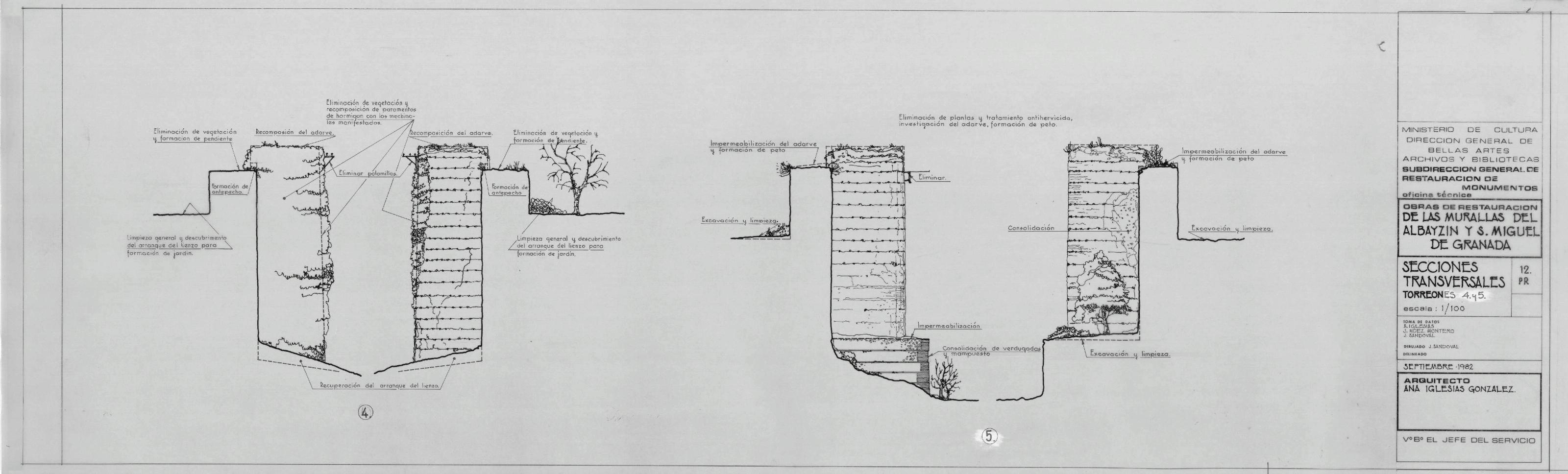 MURALLAS DEL ALBAYCIN Y SAN MIGUEL.- GRANADA-: SECCIONES TRANSVERSALES, TORREONES 4 Y 5 En este plano tenemos dibujados, las actuaciones a realizar.como: Formacion de peto, eliminacion de plantas, demolicion de muro, limpieza general del paramento... plano sin acotar.