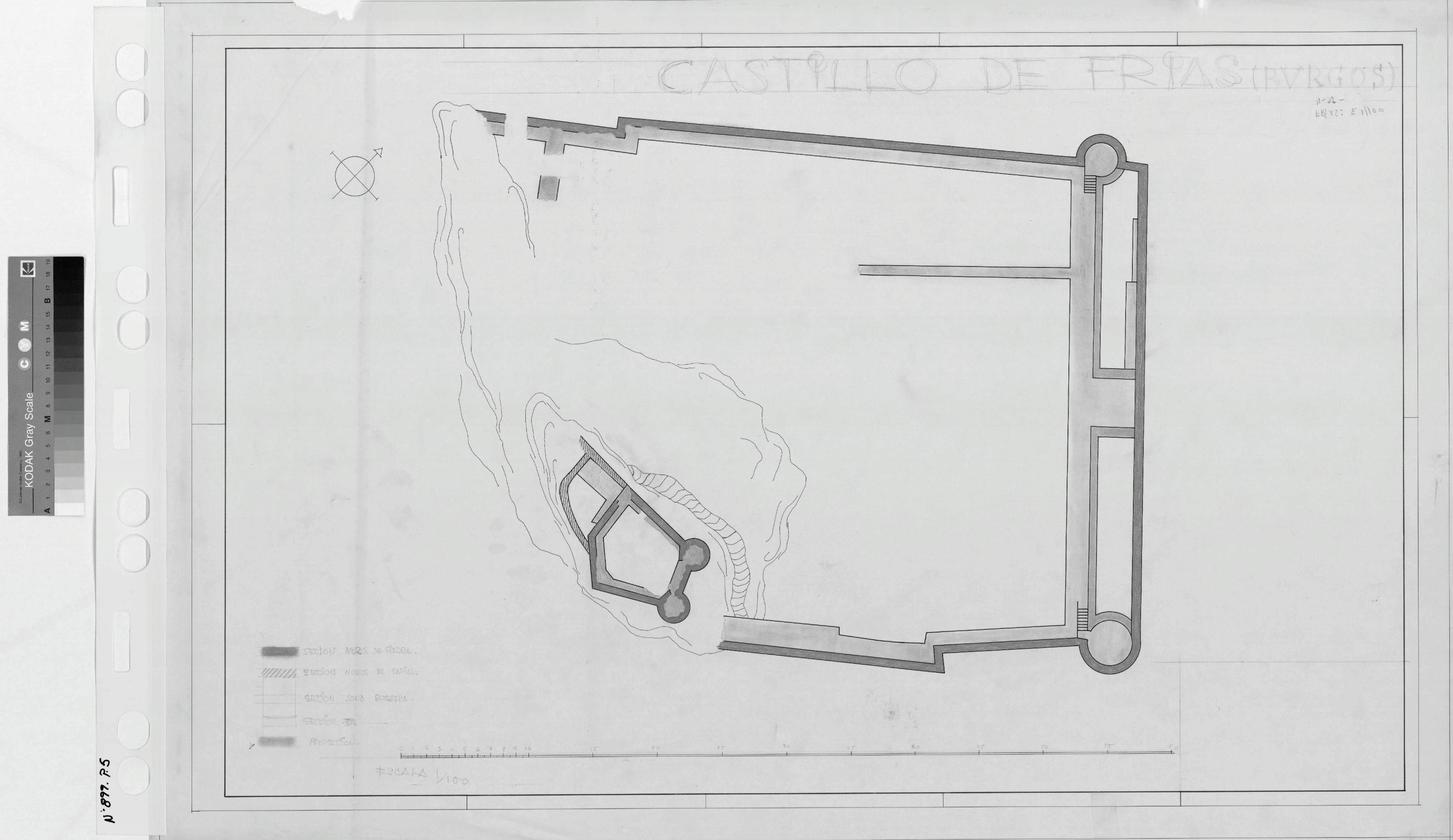 CASTILLO DE FRIAS - BURGOS-: PLANTA ALTA.. Planta , donde se ven marcados los muros sombreados, en este plano aparece una leyenda a lapiz con varias secciones señaladas , dibujo sin cotas.