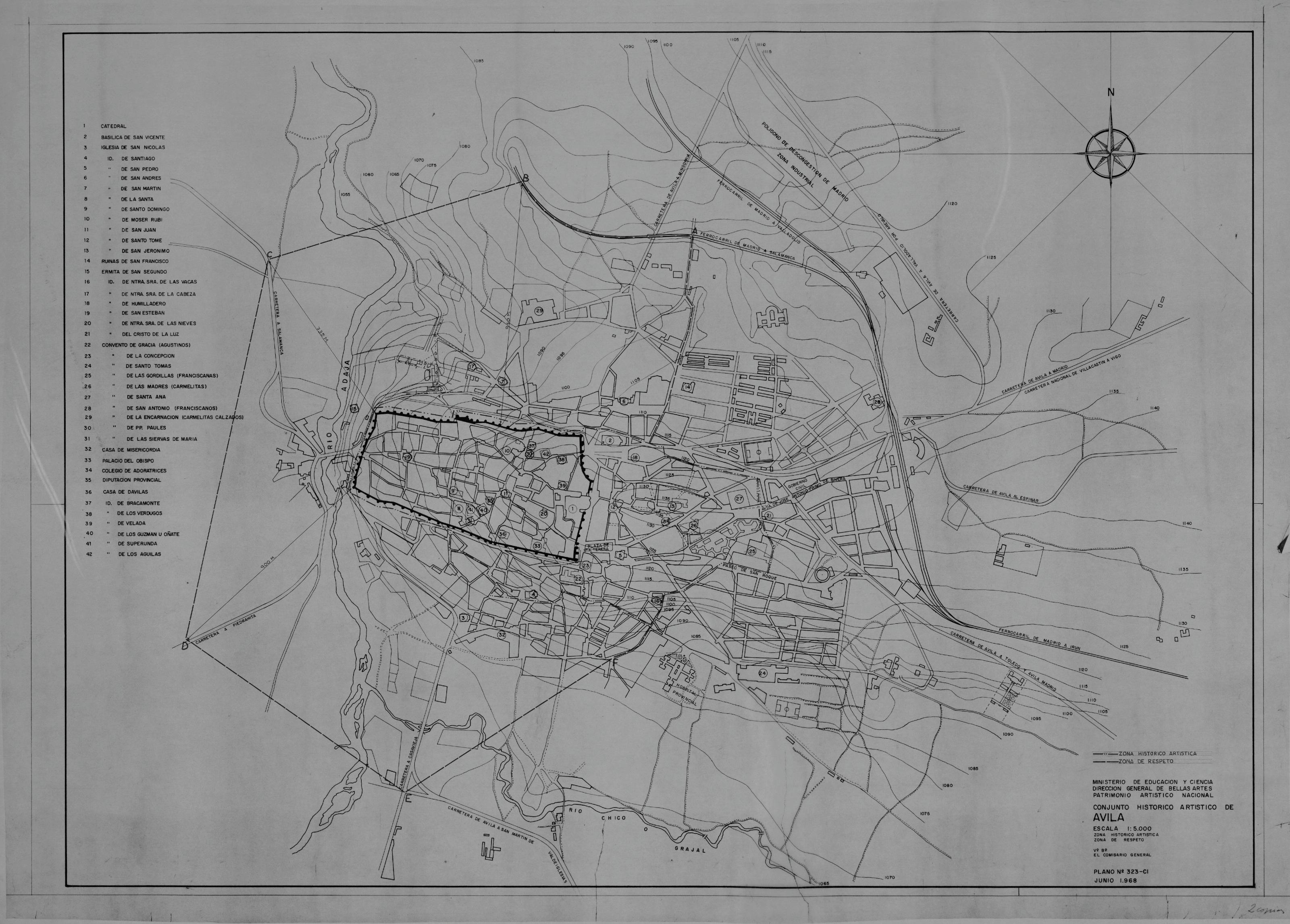 CONJUNTO HISTORICO ARTISTICO DE SANTIAGO: PLANO DE SITUACION. NUMEROS MARCA LA ZONA DE RESPETO Y ZONA HISTORICO ARTISTICA