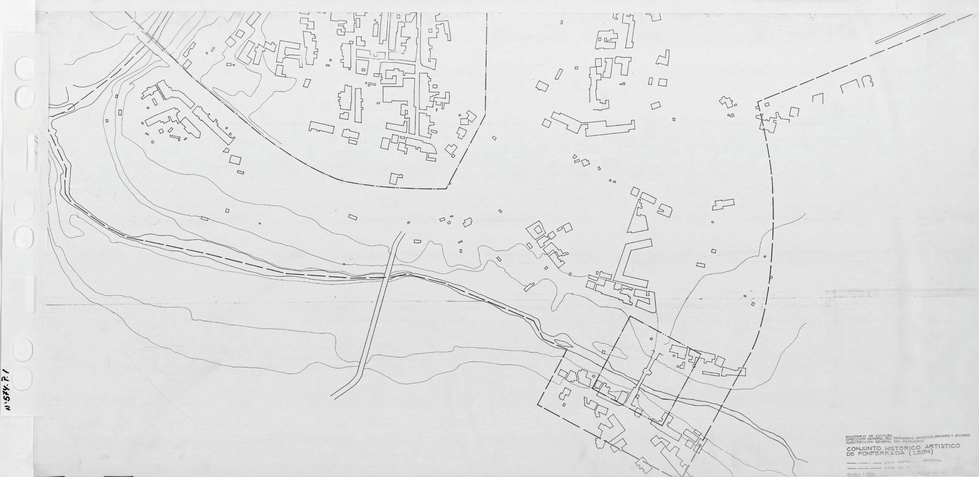 CONJUNTO HISTORICO ARTISTICO DE PONFERRADA (León): ZONA HISTÓRICO - ARTÍSTICA Marca la estructura urbanística sin nombres de calles. Representa con línea de puntos la delimitación del Conjunto así como la zona de respeto. Menciona en sello " plano nº 371-CI