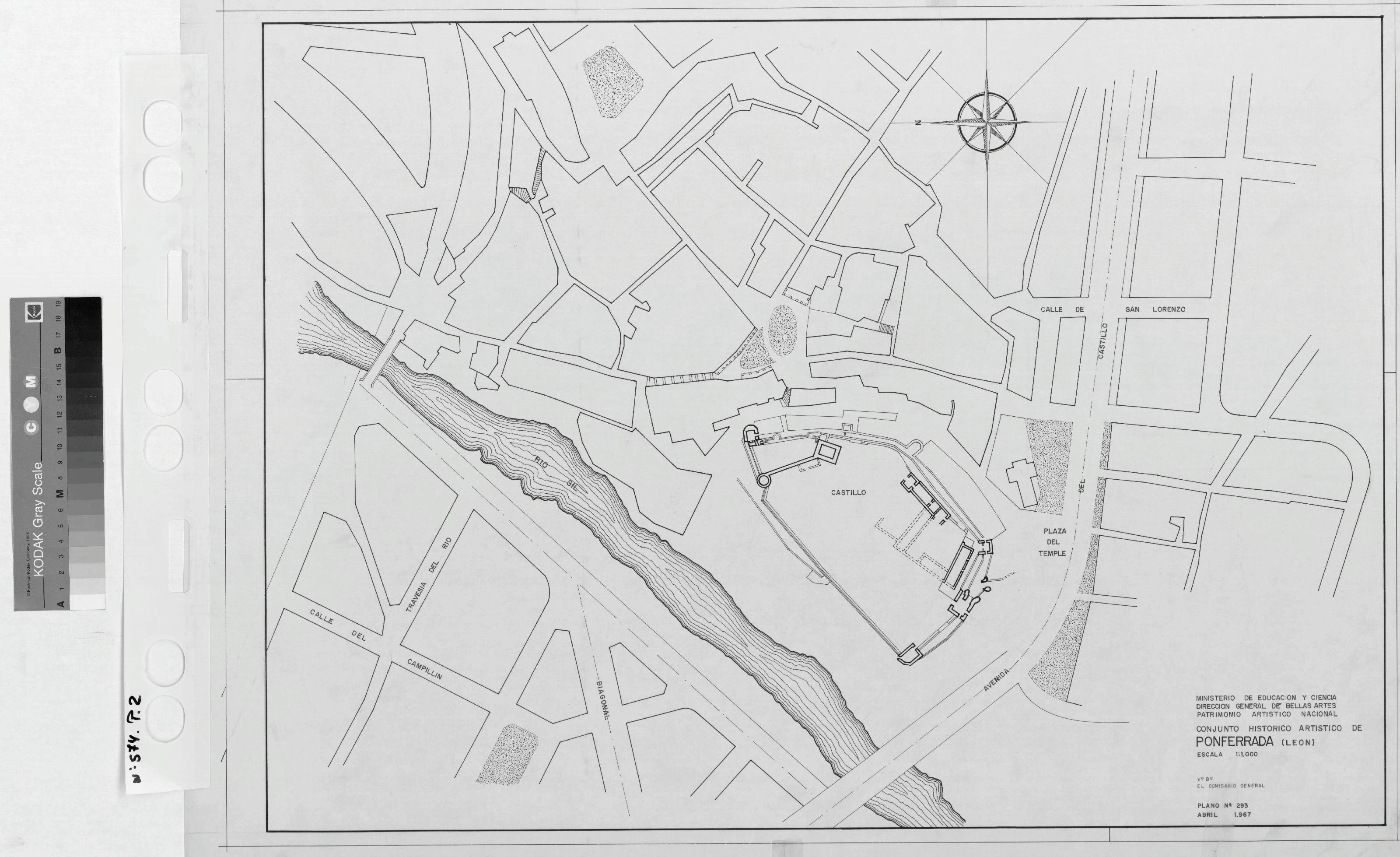CONJUNTO HISTORICO ARTISTICO DE PONFERRADA (León): ZONA HISTÓRICO - ARTÍSTICA Marca la estructura urbanística con nombres de calles. Aparece la planta del castillo, el río, así como también diversas zonas verdes. Menciona en sello " plano nº 293