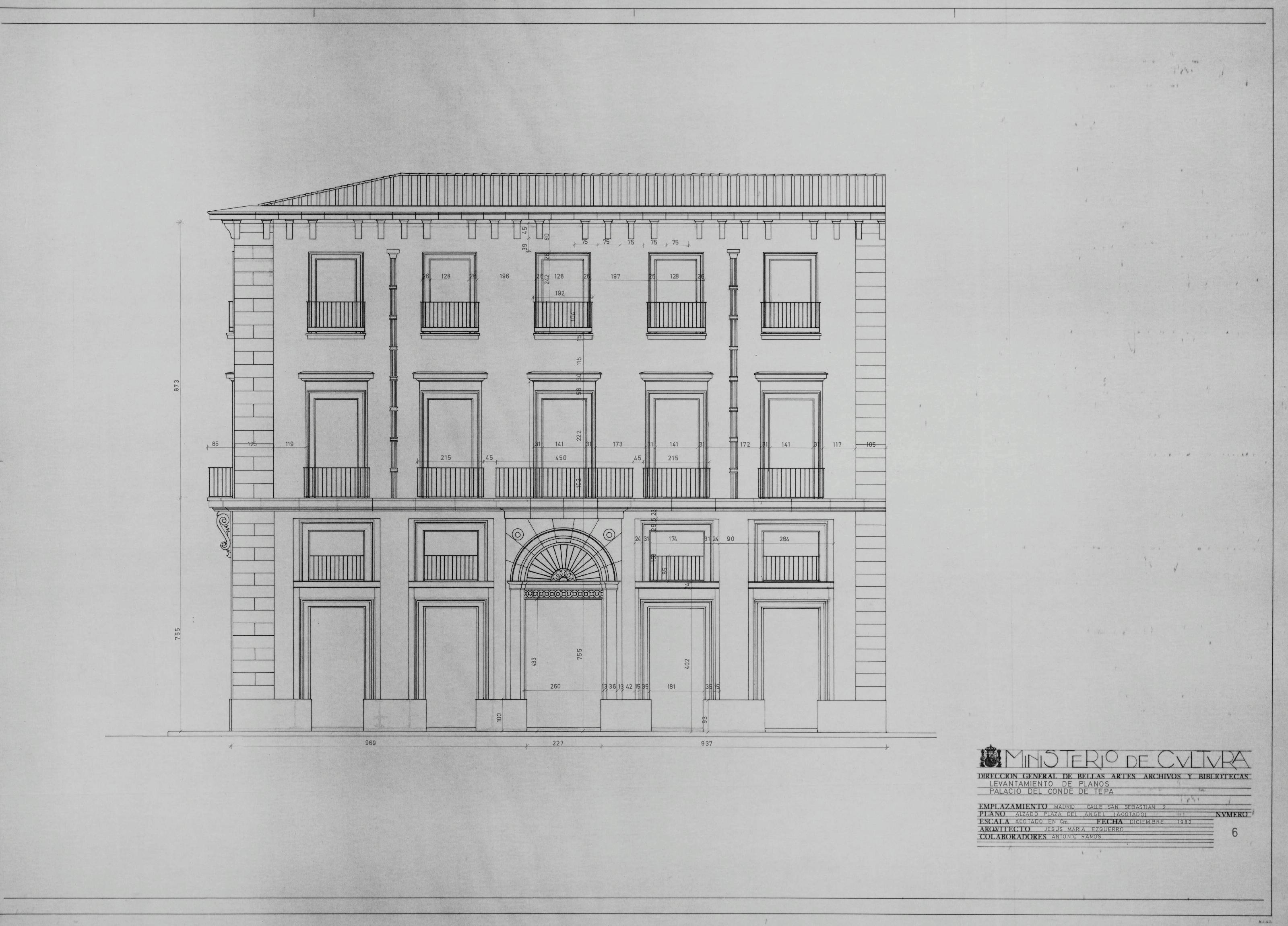 PALACIO DEL CONDE DE TEPA - MADRID-: ALZADO A PLAZA DEL ANGEL ACOTADO, Plano dibujado con detalle, marca acceso principal al edificio, Emplazamiento a calle de San Sebastian nº 2.