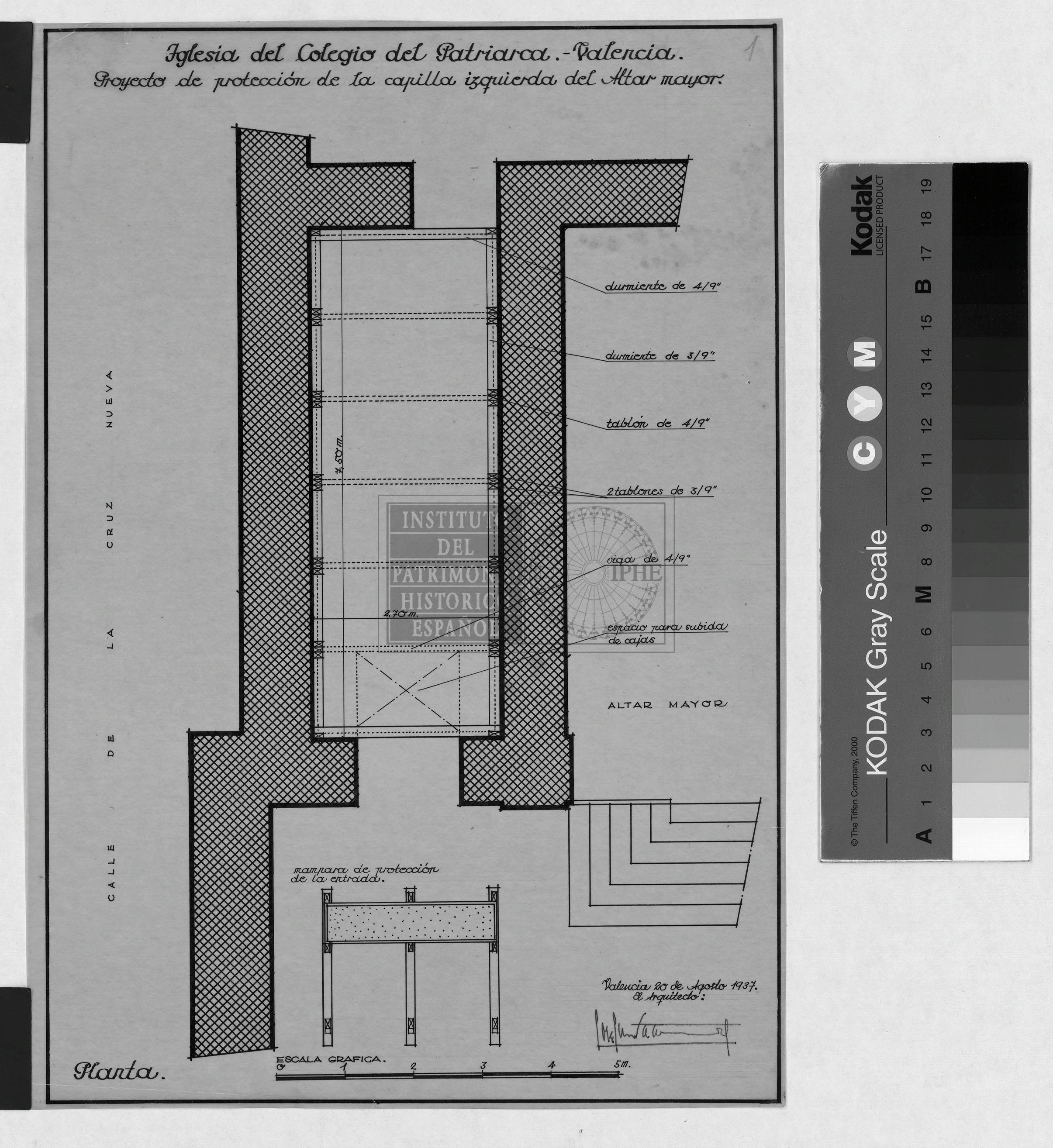 Iglesia del Colegio del Patriarca (Valencia).: Proyecto de protección de la capilla izquierda del Altar mayor. Planta. Fdo. Valencia 20 Agosto 1937, el arquitecto: José Lino Vaamonde. (31,7x22,2 cm). Procedente de la Donación José Lino Vaamonde Horcada (2001, 1ª entrega). Actualmente ubicado en Archivador 42.4. de la FIA.