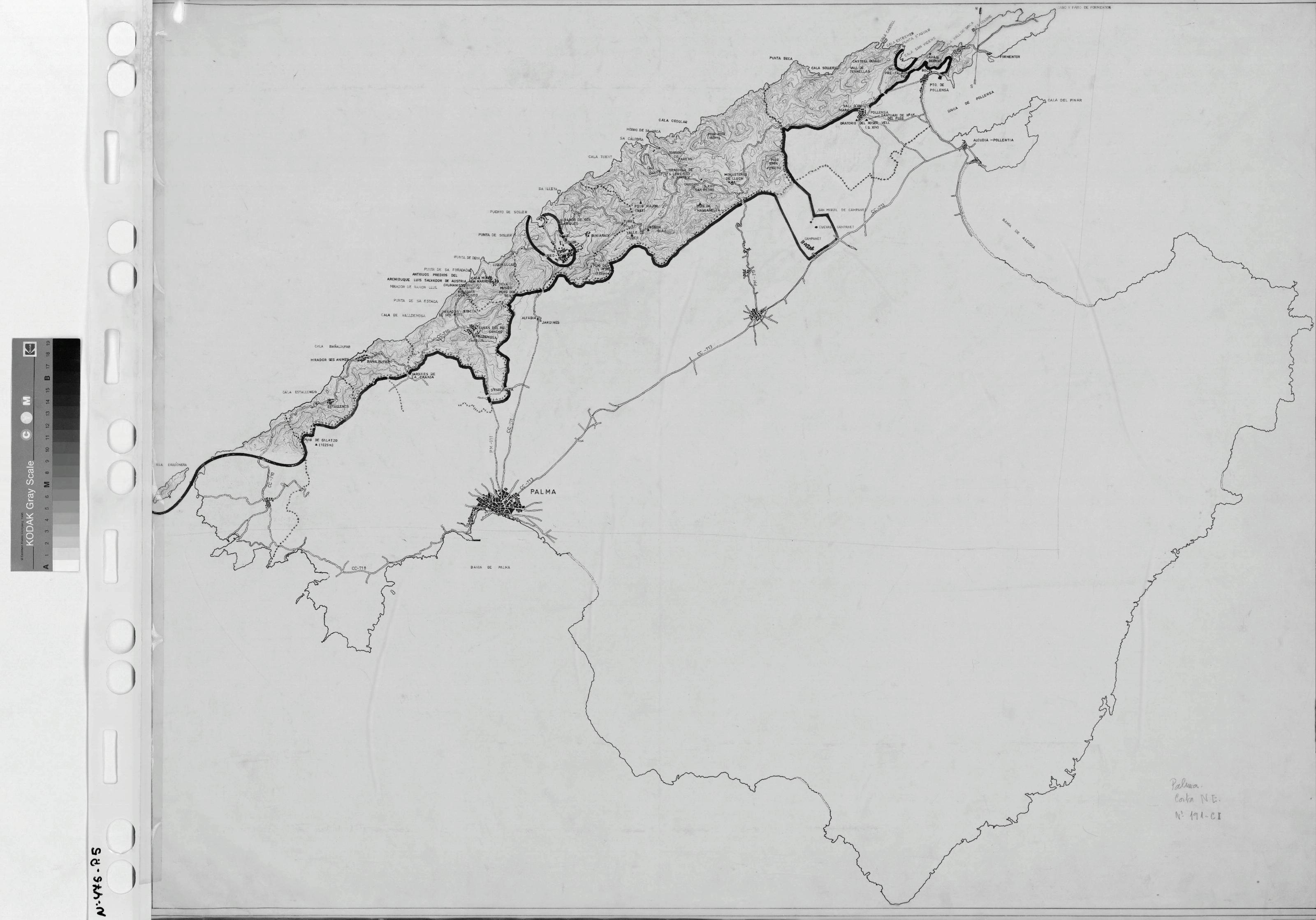 CONJUNTO HISTORICO ARTISTICO DE PALMA DE MALLORCA.: PLANO DE SITUACION. Nos describe perfectamente toda la costa Noroeste de palma, con nomenclatura de calles, bahias, calas y parajes de las zona, curvas de nivel dibujadas en color sepia y delimitacion de entornos.