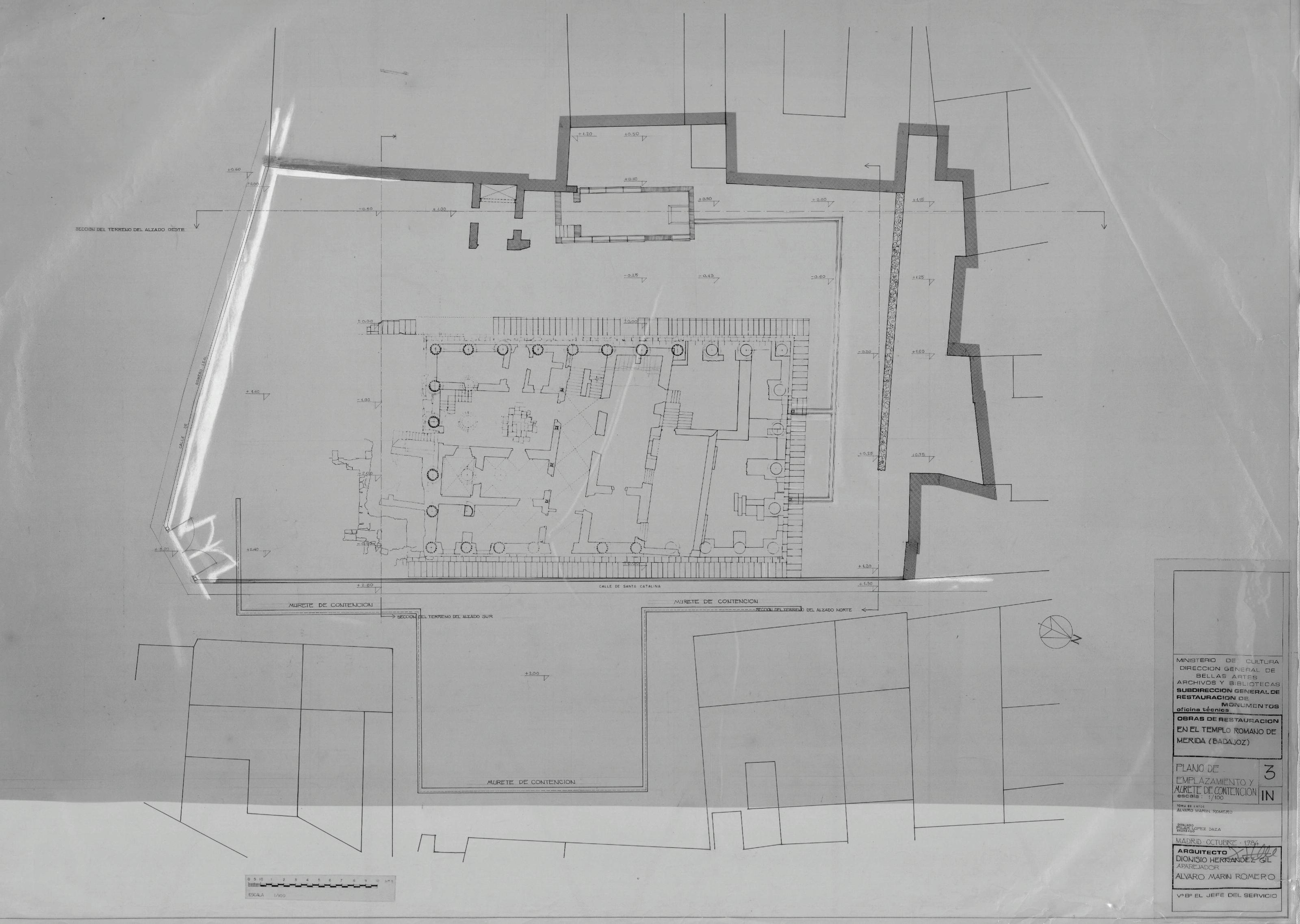 OBRAS DE RESTAURACION EN EL TEMPLO ROMANODE MERIDA (Badajoz): PLANO DE EMPLAZAMIENTO Y MURETE DE CONTENCIONCon dibujo de planta a escala, sombreado y cotas de nivel del TemploCon lineas de sección terreno de corte para los diferentes alzadosSolares adyacentes.Con escala gráfica Firmado