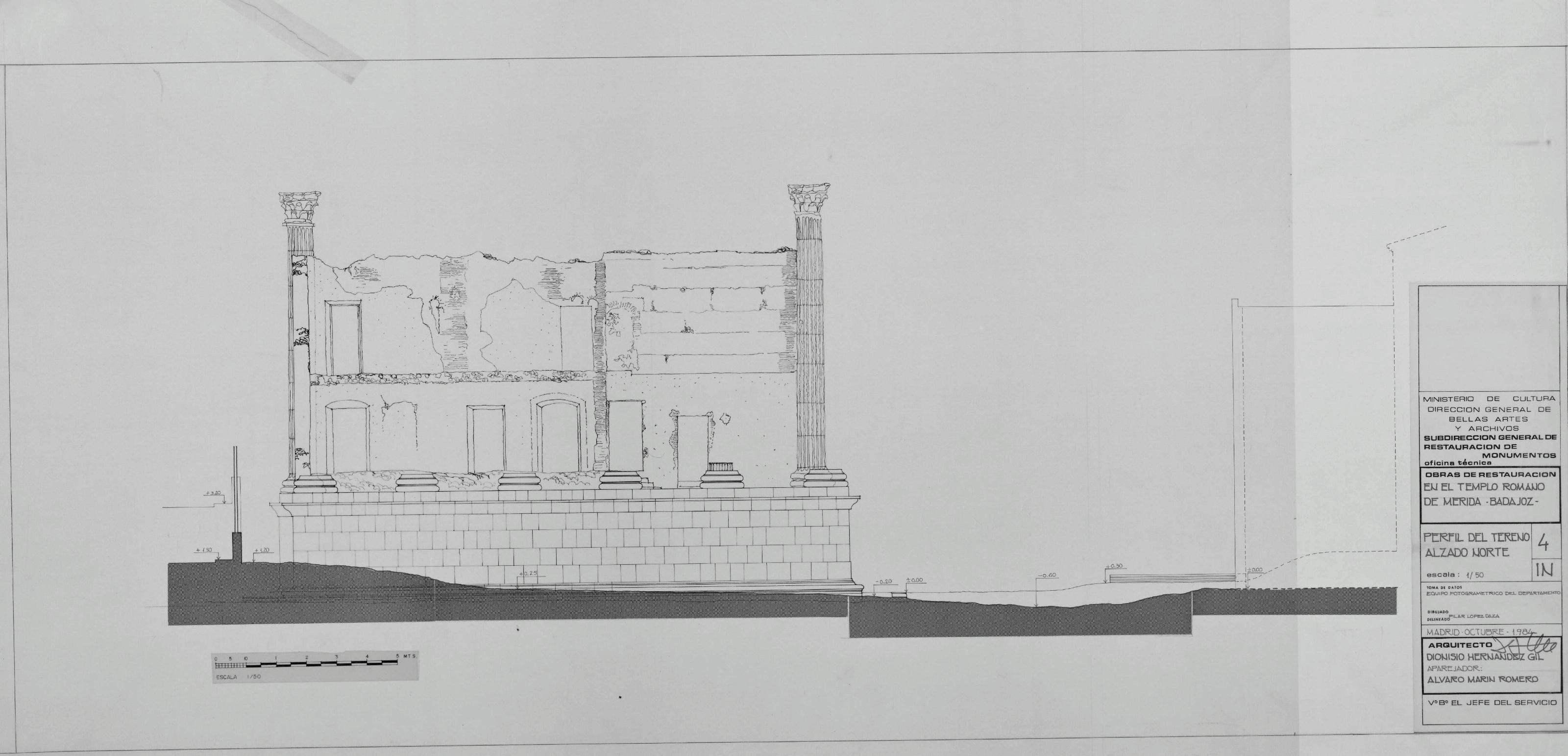 OBRAS DE RESTAURACION EN EL TEMPLO ROMANO DE MERIDA (Badajoz): PERFIL DEL TERRENO ALZADO NORTE La sección del terreno con cotas de nivel y sombreado con trama adhesiva Con escala gráfica y Firmado