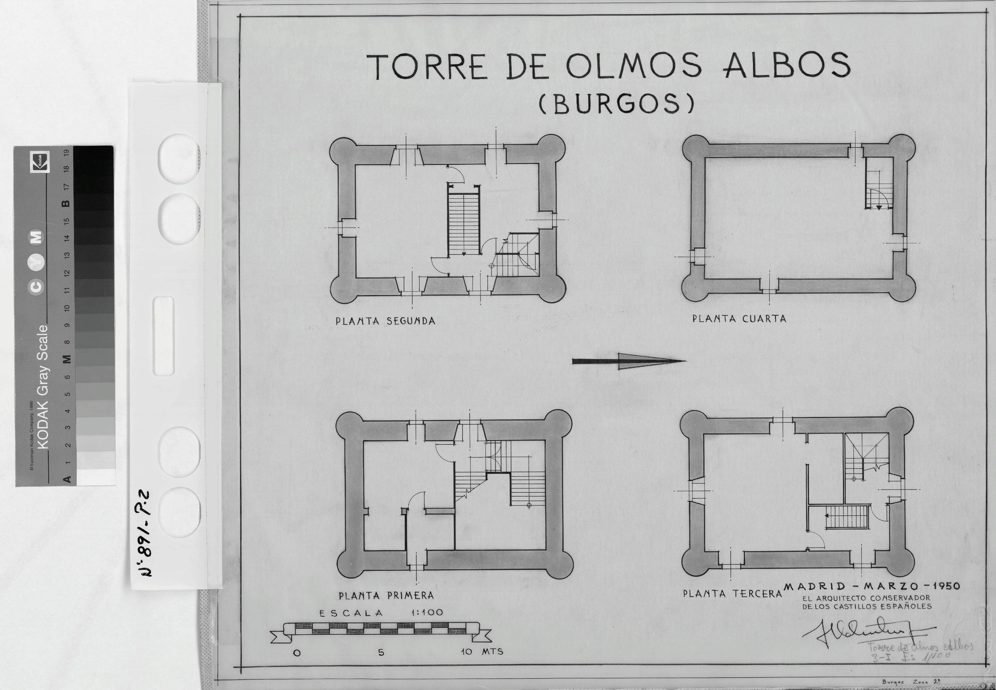 CASTILLO TORRE DE OLMOS ALBOS - BURGOS -: PLANTAS: PRIMERA, SEGUNDA, TERCERA Y CUARTA.. Planos de planta , muros regruesados y escalera de acceso. Plano sin acotar.