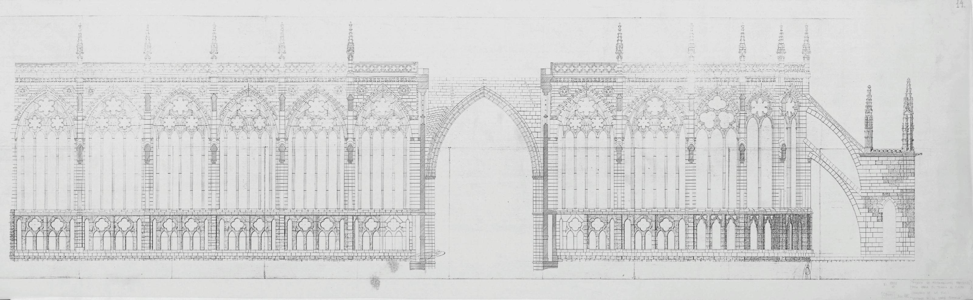 CATEDRAL DE LEON: VENTANAS DE LA PARTE SUPERIOR Pone a lápiz: "Proyecto de restauraciones parciales para abrir el templo al culto. Tiene sombreados y despieces de piedra e indica escala: 0,025/2