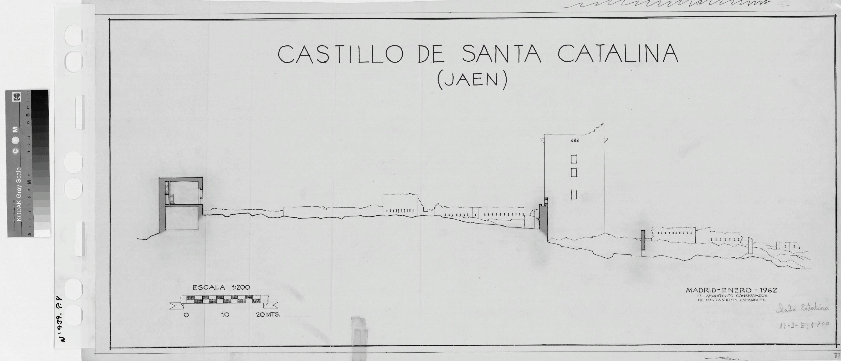 CASTILLO DE SANTA CATALINA . JAEN. -: ALZADO LATERAL DEL CASTILLO. plano con muros regruesados y seccionados de algunas zonas del recinto del castillo. Plano sin cotas.