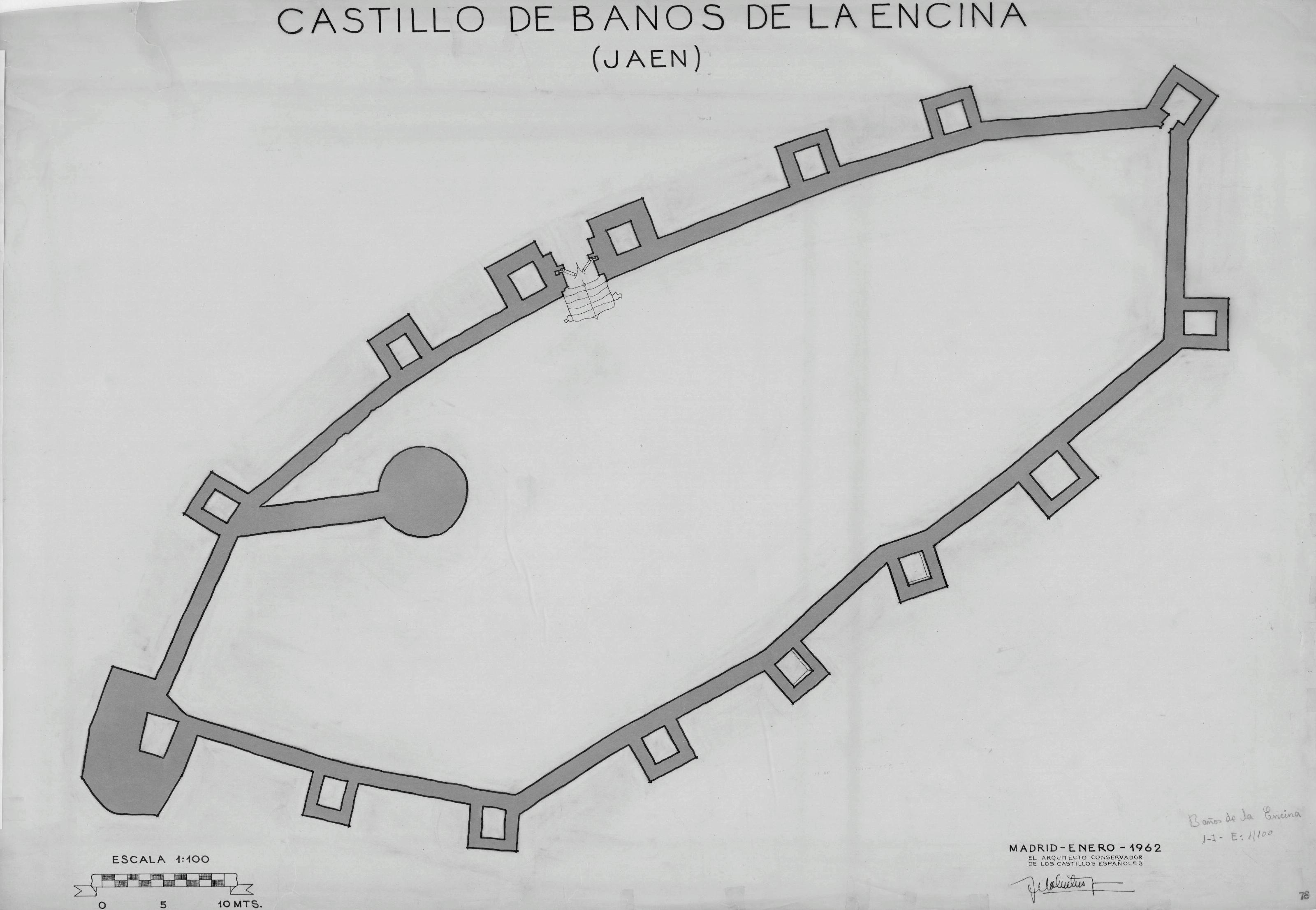 CASTILLO DE BAÑOS DE LA ENCINA - JAEN. -: PLANTA GENERAL DEL CASTILLO, Plano con muros regruesados y sombreados, sin cotas.