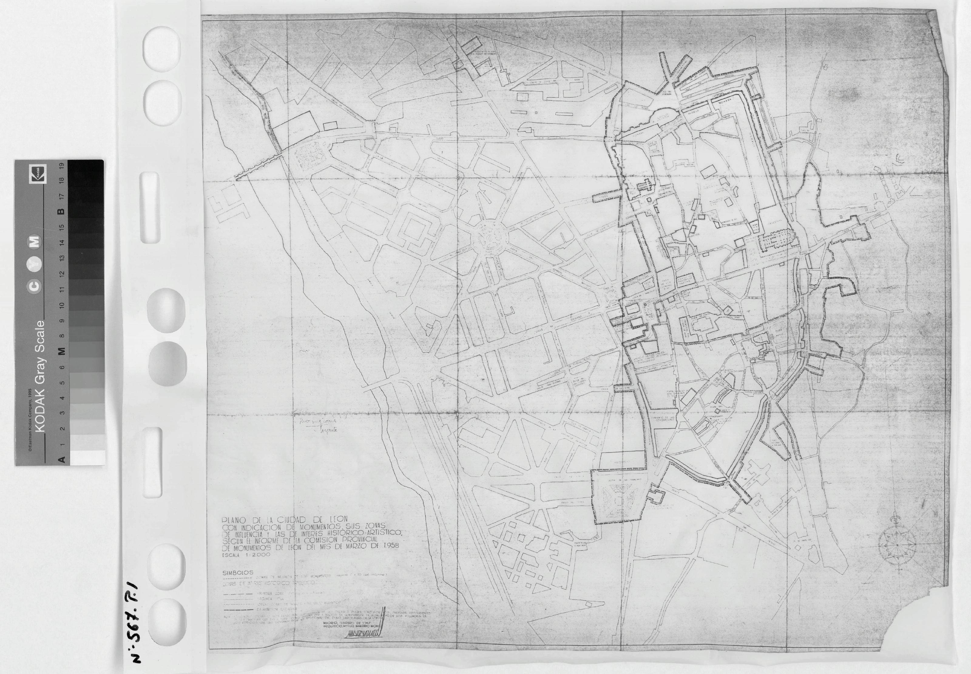 CONJUNTO HISTORICO ARTISTICO DE LEON (León): Pone en sello: "PLANO DE LA CIUDAD DE LEON, Con indicación de Monumentos, sus zonas de influencia y las de interés histórico artístico. Según el informe de la comisión provincial de Monumentos de León del mes de Marzo de 1958". Contiene leyenda de símbolos y nomenclatura de sitios. Firmado. Parece copia reducida de plano antiguo.