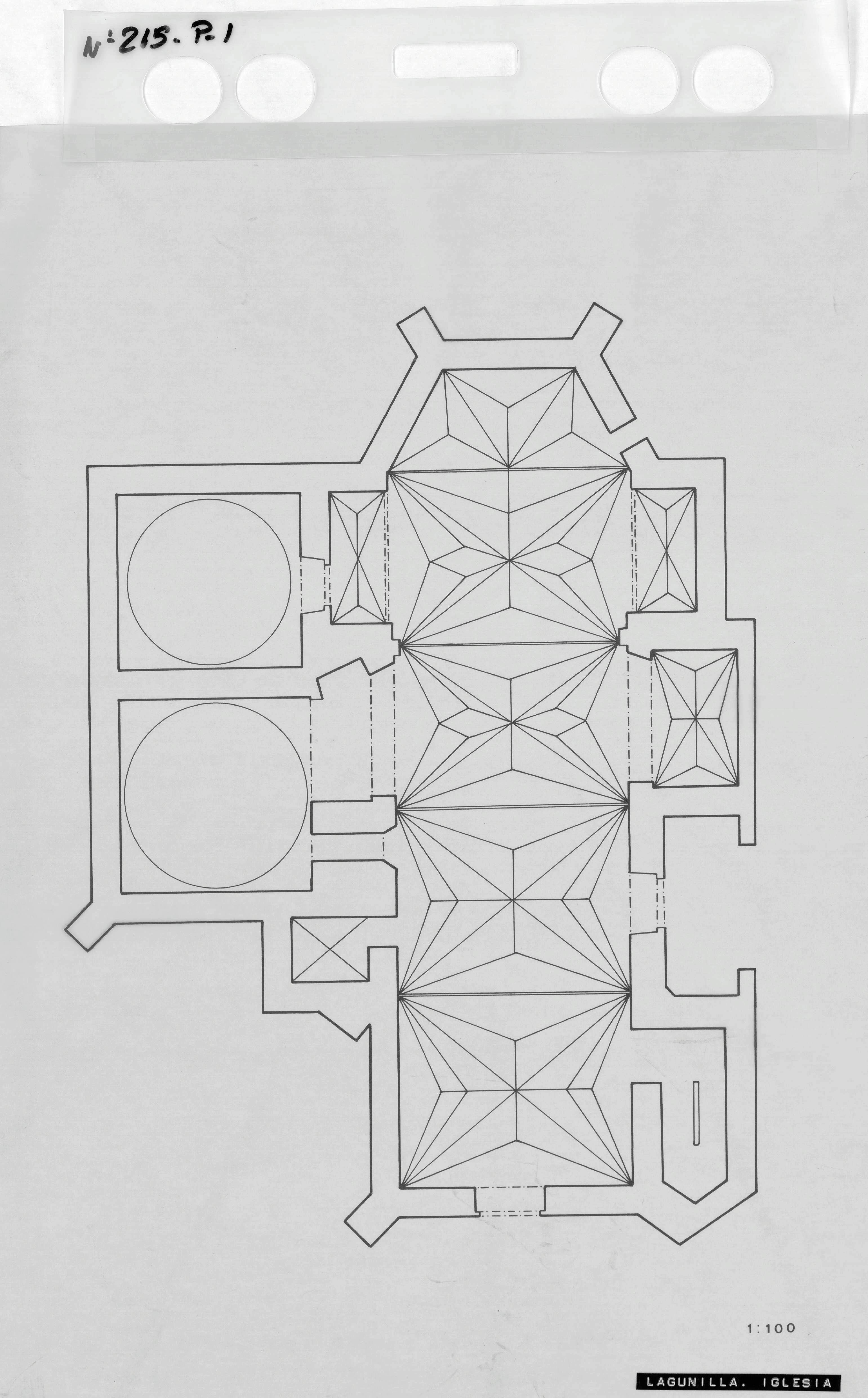 IGLESIA DE LAGUNILLA: PLANTA GENERAL, plano de planta con proyeccion de bovedas y muros rayados ,sin cotas.
