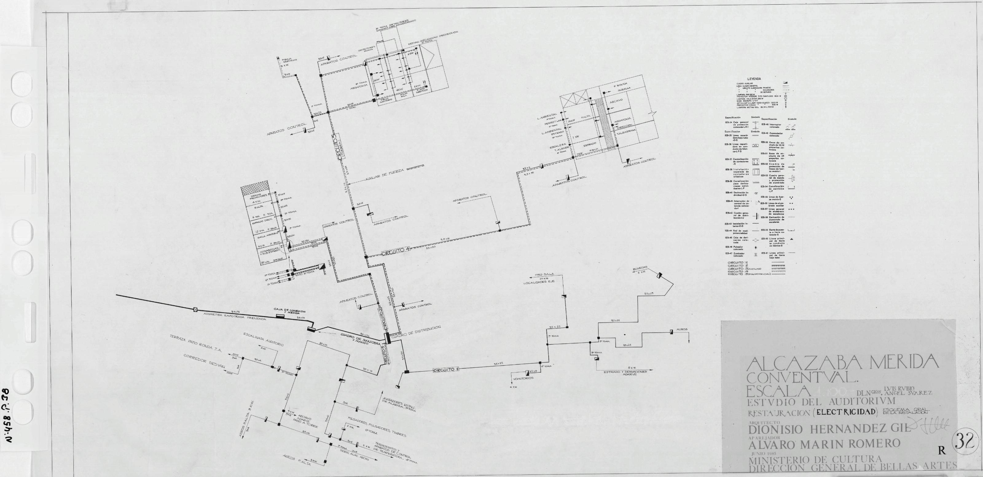 ALCAZABA DE MERIDA (Badajoz) Estudio del Auditorium: ELECTRICIDAD - Restauración - ESQUEMA GENERAL INSTALACIÓN Con Leyenda. Bastante detallado con circuitos, potencias y tomas. Firmado