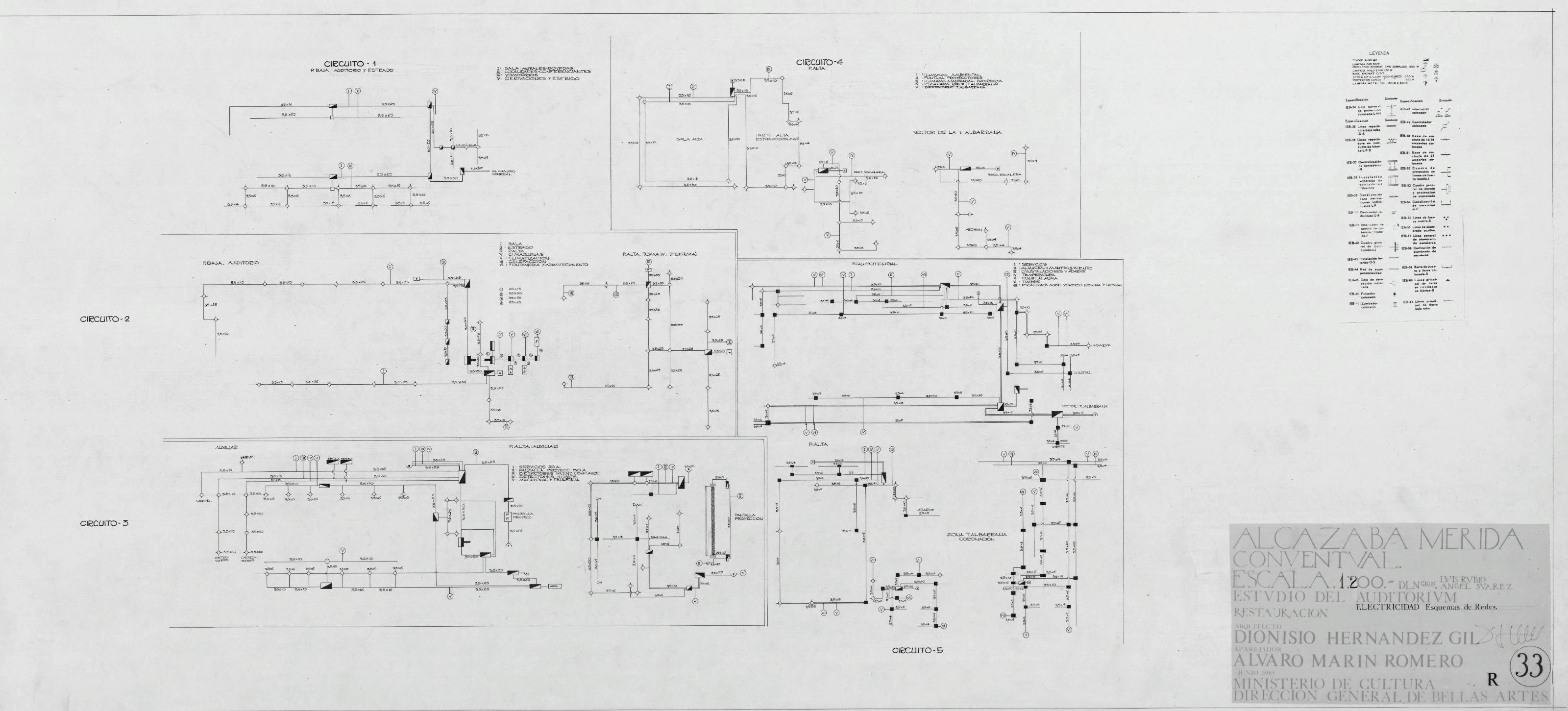 ALCAZABA DE MERIDA (Badajoz) Estudio del Auditorium: ELECTRICIDAD - Restauración - ESQUEMAS DE REDES Con Leyenda. Bastante detallado con circuitos, potencias y tomas. Correspondencias con cada sector. Firmado