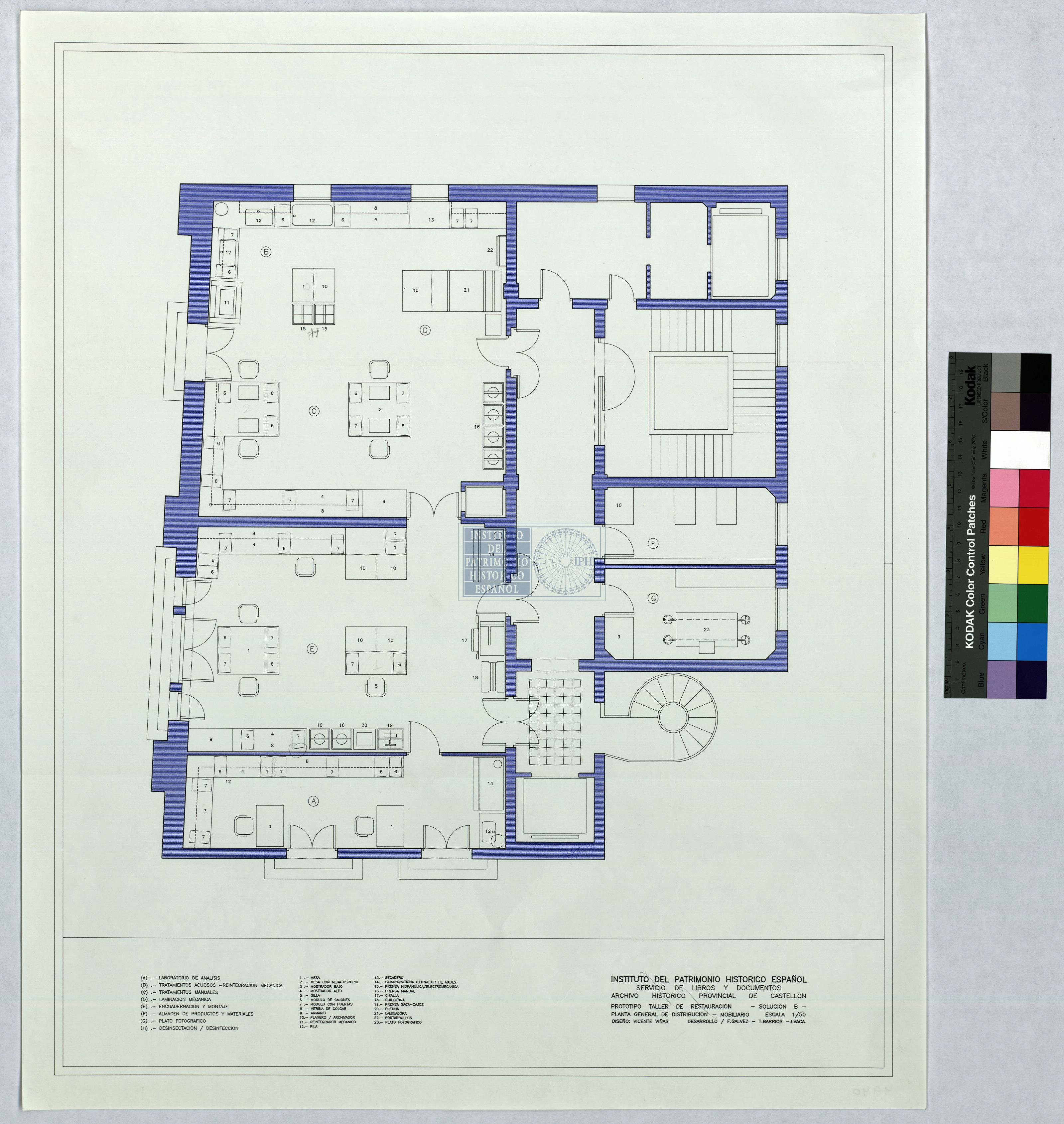 ARCHIVO HISTORICO PROVINCIAL DE CASTELLON.: PROTIPO TALLER DE RESTAURACION. SOLUCION B-PLANTA GENERAL DE DISTRIBUCION. MOBILIARIO.