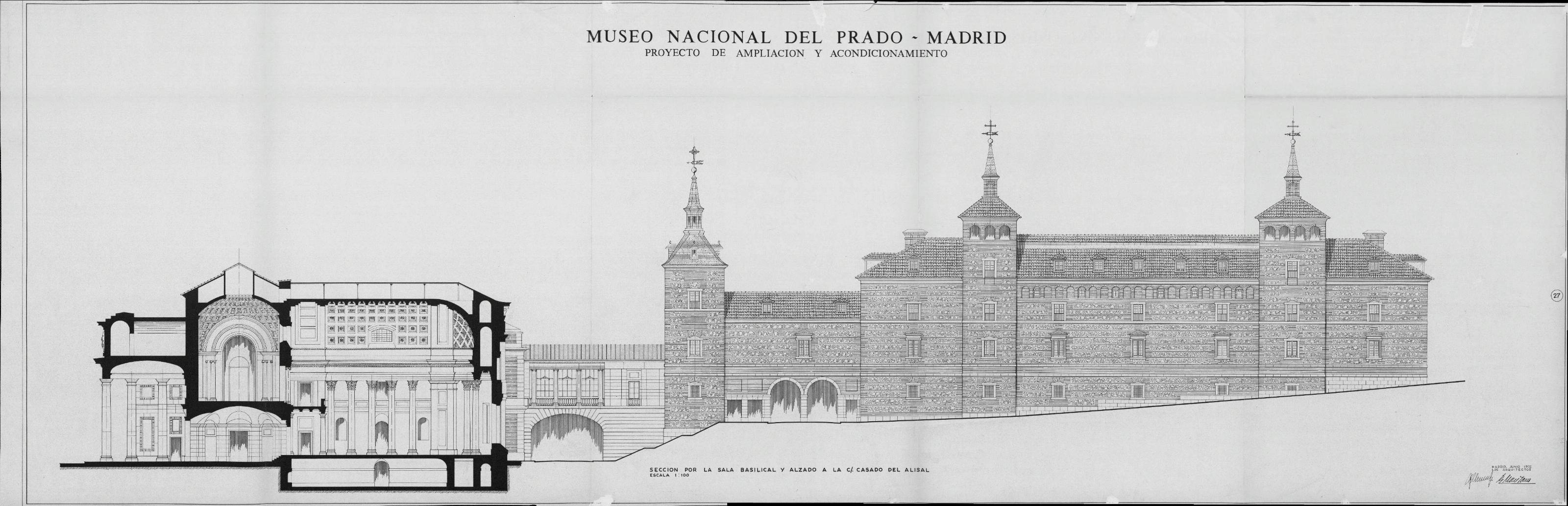 MUSEO NACIONAL DEL PRADO: SECCION POR LA SALA BASILICAL Y ALZADO A LA CALLE DEL ALISAL