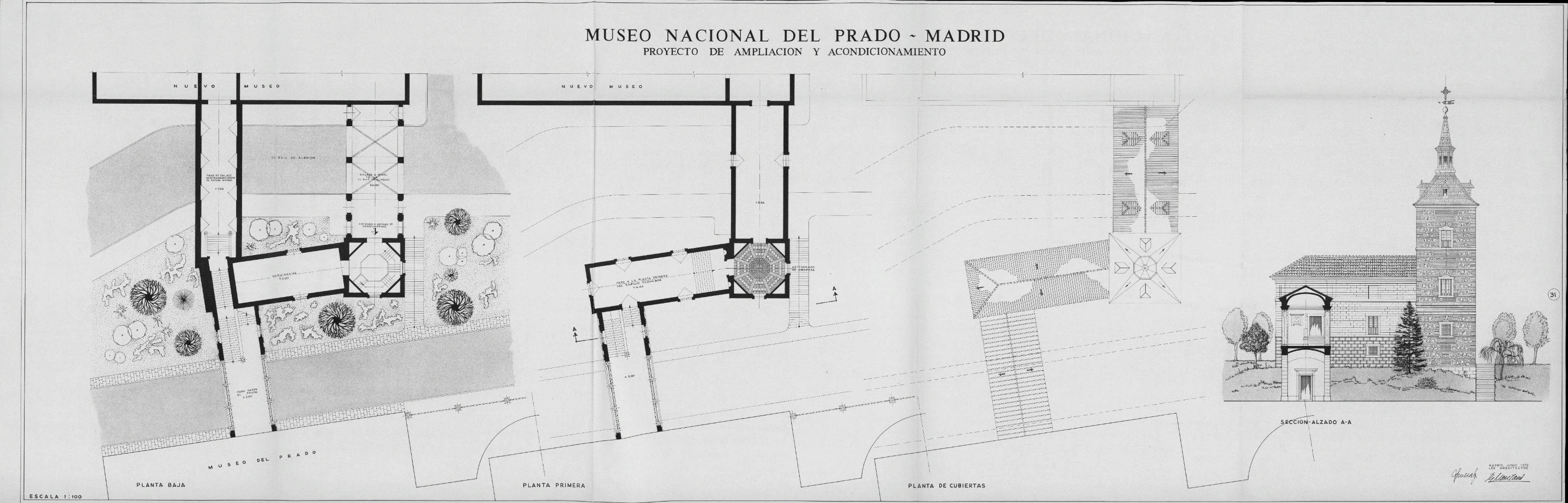 MUSEO NACIONAL DEL PRADO: PLANTA BAJA, PLANTA PRIMERA, PLANTA DE CUBIERTAS. SECCION ALZADO A-A