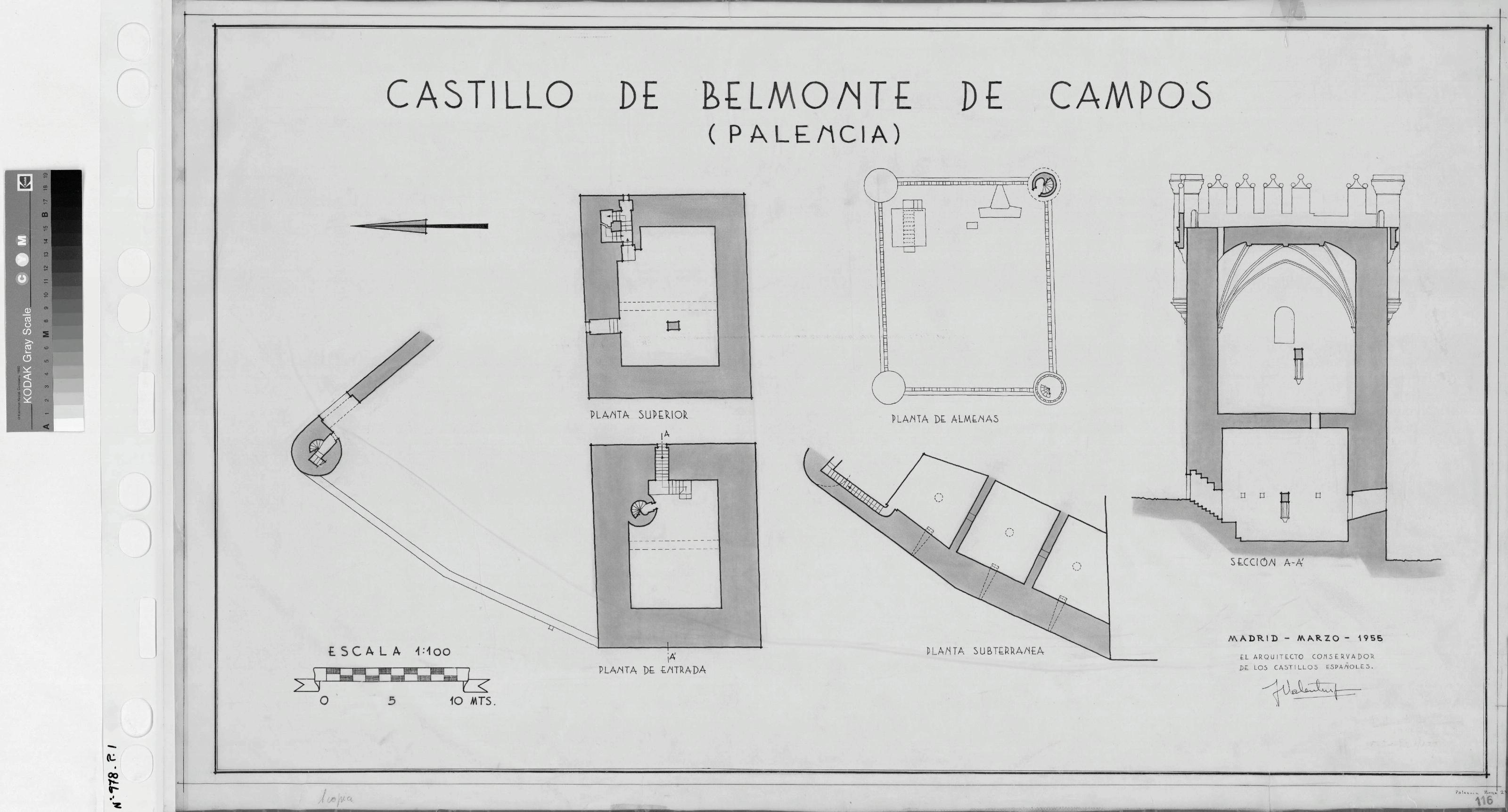 CASTILLO DE BELMONTE DE CAMPOS: PLANTA Y SECCION. PLANTA DE ENTRADA, PLANTA SUPERIOR, PLANTA DE ALMENAS, PLANTA SUBTERRANEA Y SECCION 1-1'