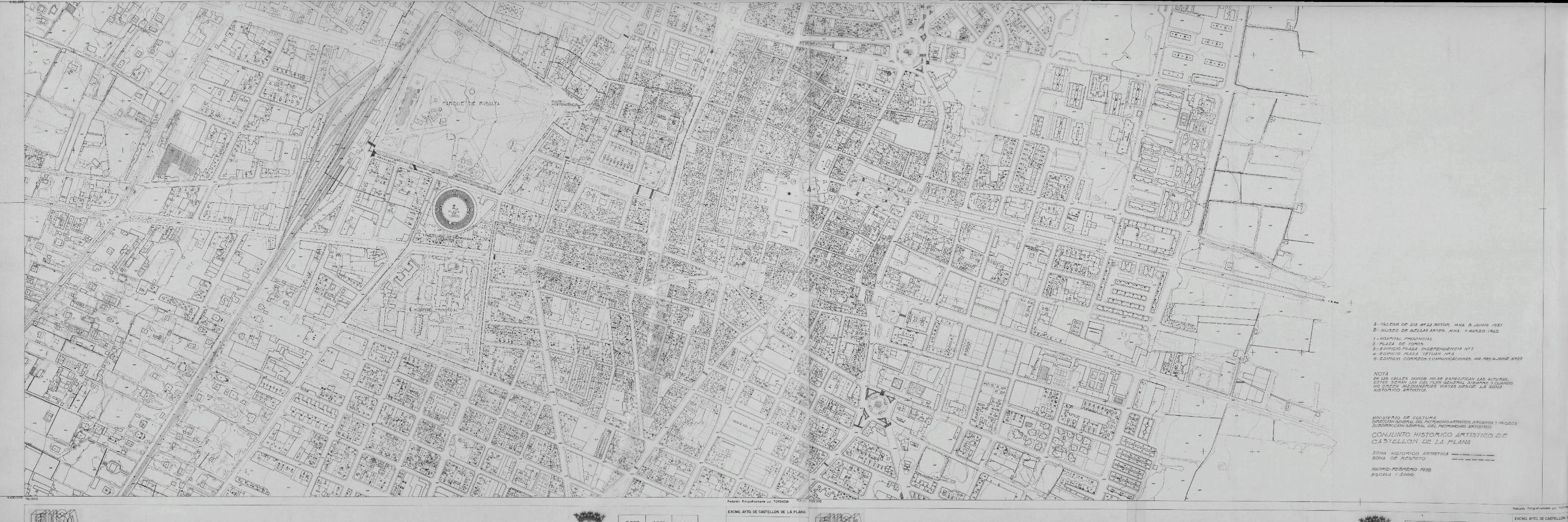 CONJUNTO HISTORICO ARTISTICO (PROPUESTA) DEL PARQUE DE RIBALTA,- CASTELLON DE LA PLANA. -: PLANO DE SITUACION, o emplazamiento de la propuesta del conjunto historico del parque de Ribalta, P. De la Independencia y P. de Tetuan, vemos marcada una leyenda con edificios pertenecientes al casco antiguo, y la delimitacion de propuesta del conjunto historico y la zona de respeto, plano sin cotas.