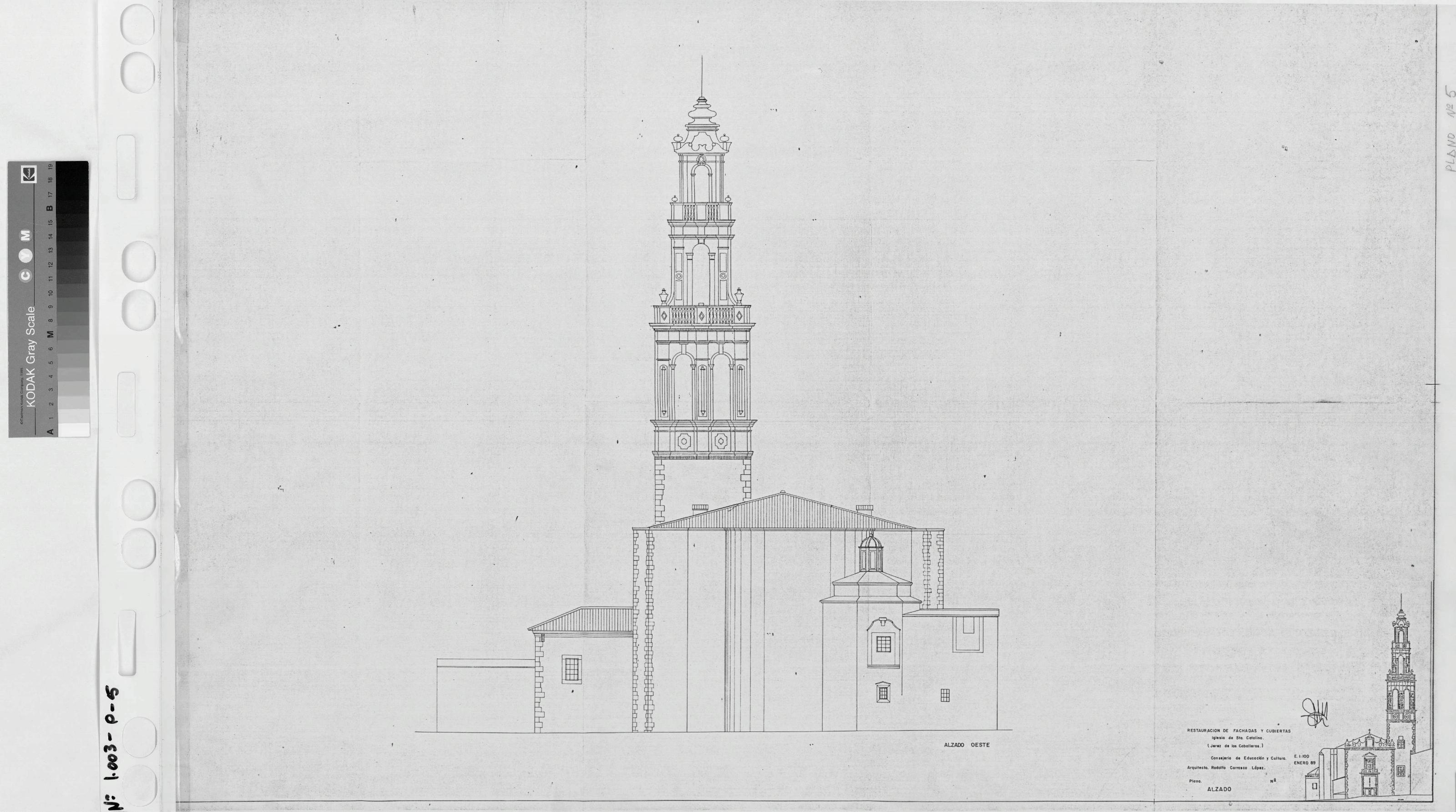 IGLESIA DE SANTA CATALINA JEREZ DE LOS CABALLEROS (Badajoz): ALZADO OESTE Pone en sello RESTAURACIÓN DE FACHADAS Y CUBIERTA Representación sencilla de lineas, recercados de huecos y rayado de Cubiertas. Parece reproducción de documento original. Firmado.