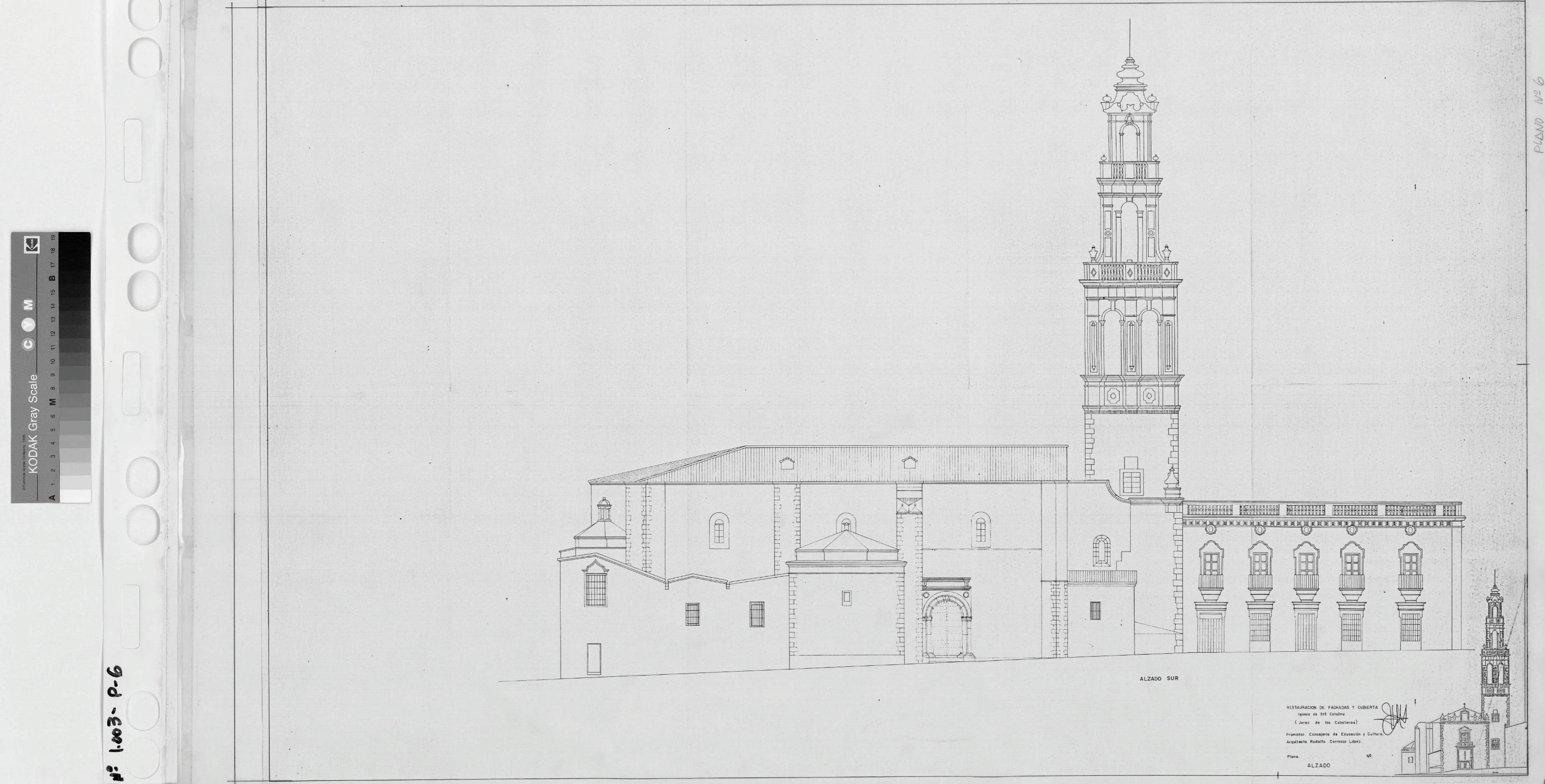 IGLESIA DE SANTA CATALINA JEREZ DE LOS CABALLEROS (Badajoz): ALZADO SUR Pone en sello RESTAURACIÓN DE FACHADAS Y CUBIERTA Representación sencilla de lineas, recercados de huecos y rayado de Cubiertas. Parece reproducción de documento original. Firmado.