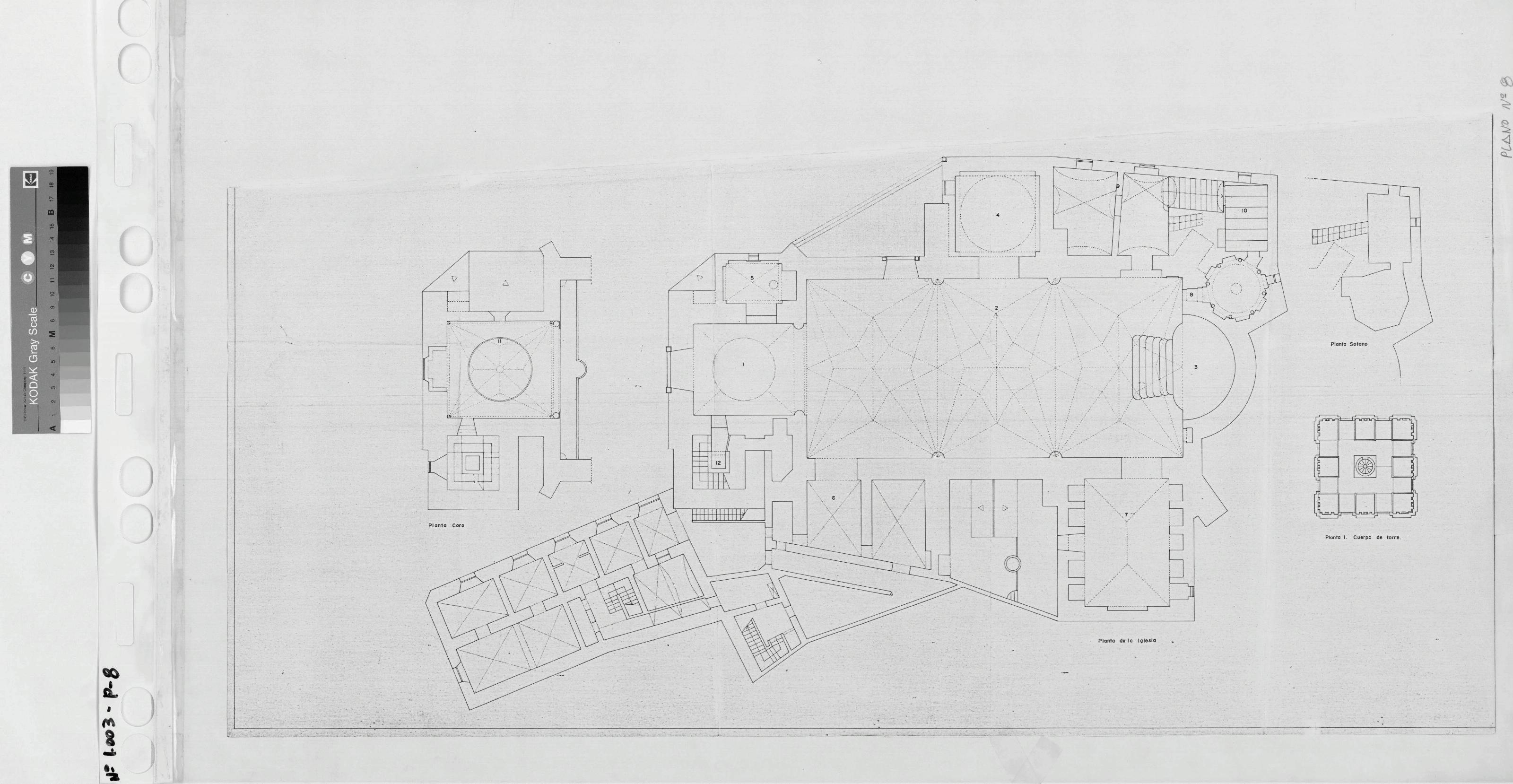 IGLESIA DE SANTA CATALINA JEREZ DE LOS CABALLEROS (Badajoz): PLANTAS Consta de 4 plantas correspondientes a sendos niveles: Planta general de Iglesia, Coro, Sótano y Torre. Con proyección de bóvedas y numeración de diferentes zonas. Parece reproducción de documento original. Sin sello.