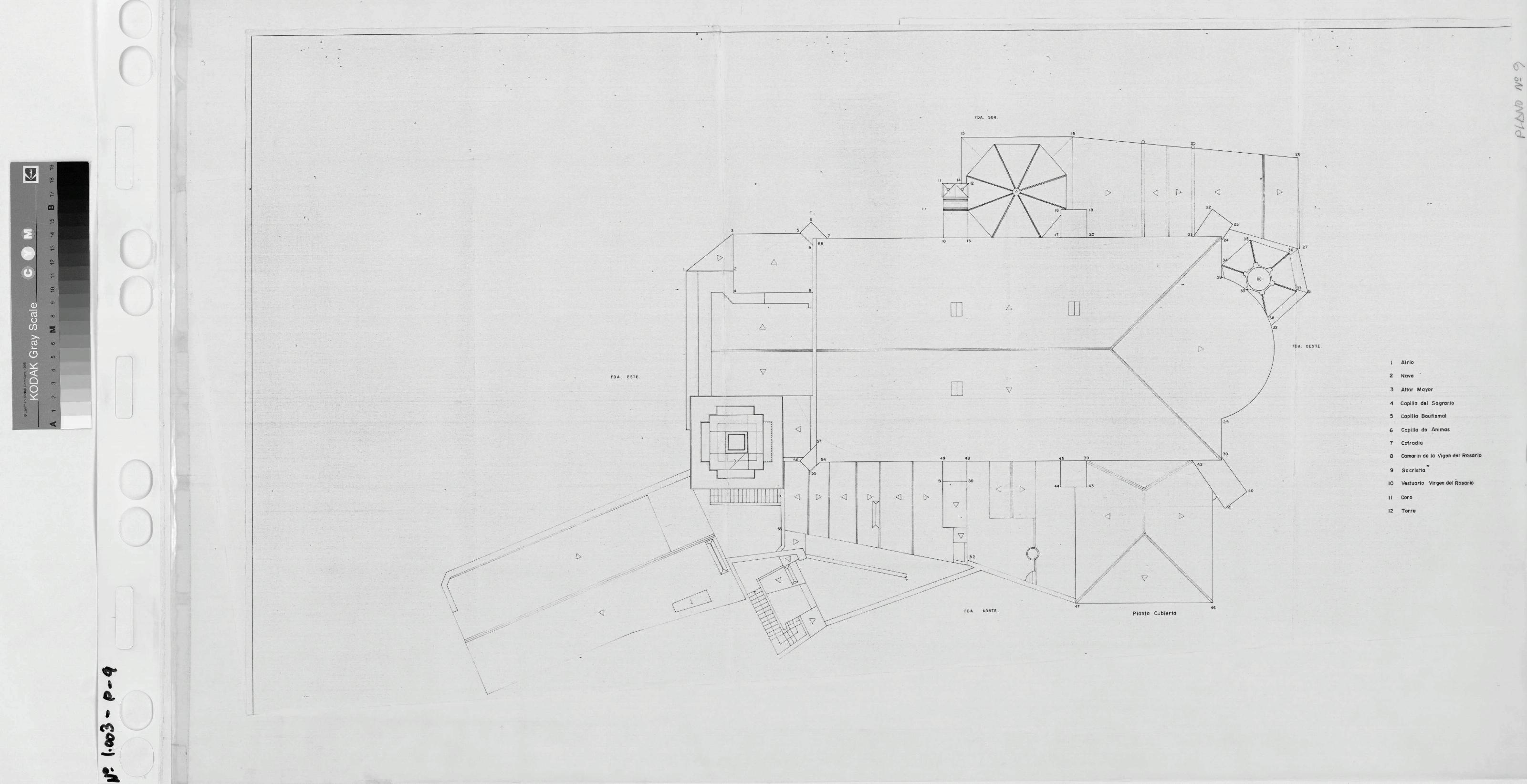 IGLESIA DE SANTA CATALINA JEREZ DE LOS CABALLEROS (Badajoz): PLANTA DE CUBIERTA Con numeración de cada encuentro y orientación de fachadas y leyenda correspondiente al anterior plano señalando las diferentes partes de la Iglesia Parece reproducción de documento original. Sin sello.