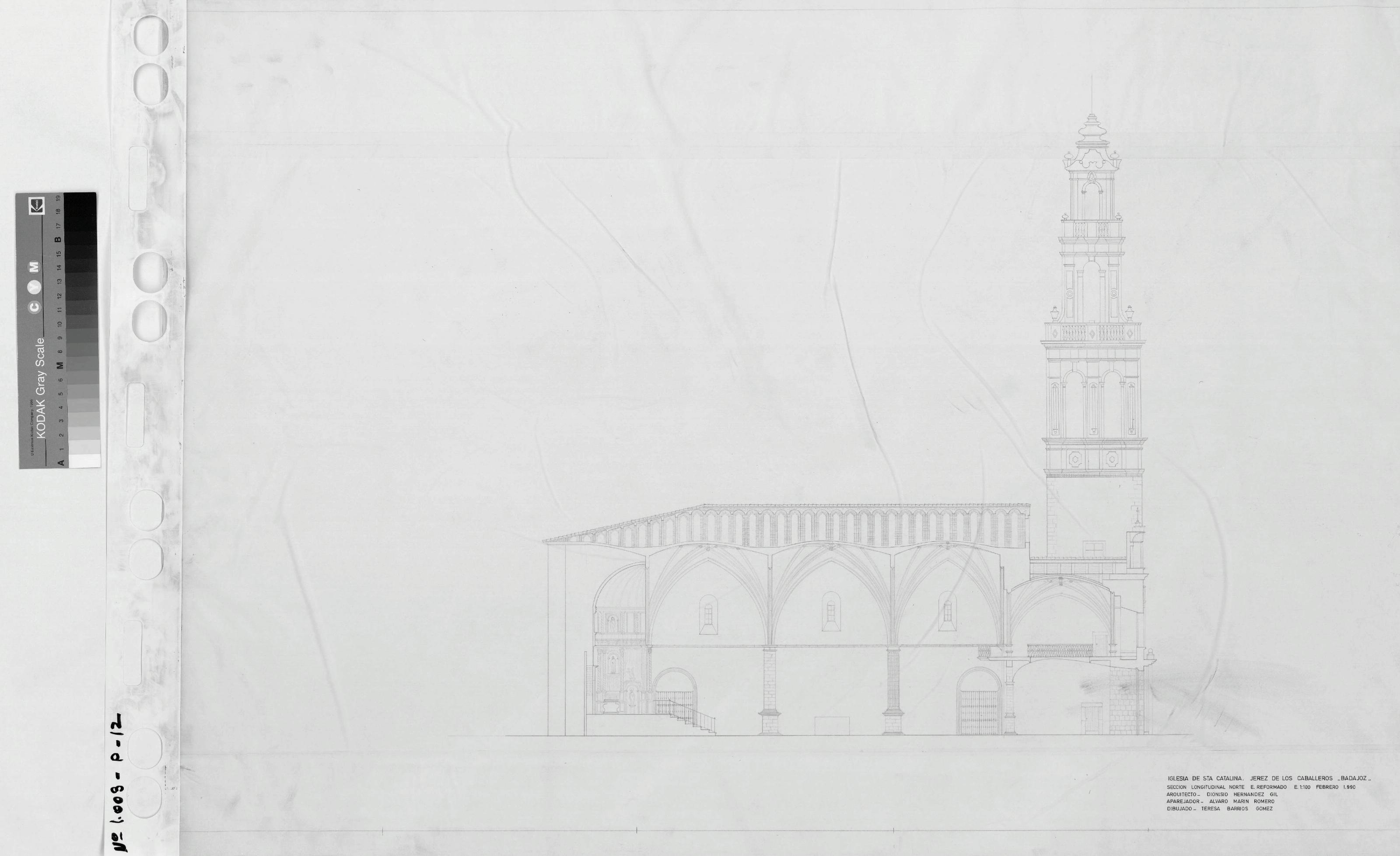 IGLESIA DE SANTA CATALINA JEREZ DE LOS CABALLEROS (Badajoz): SECCIÓN LONGITUDINAL NORTE ESTADO REFORMADO Con proyección de torre Original de el anterior a lápiz.
