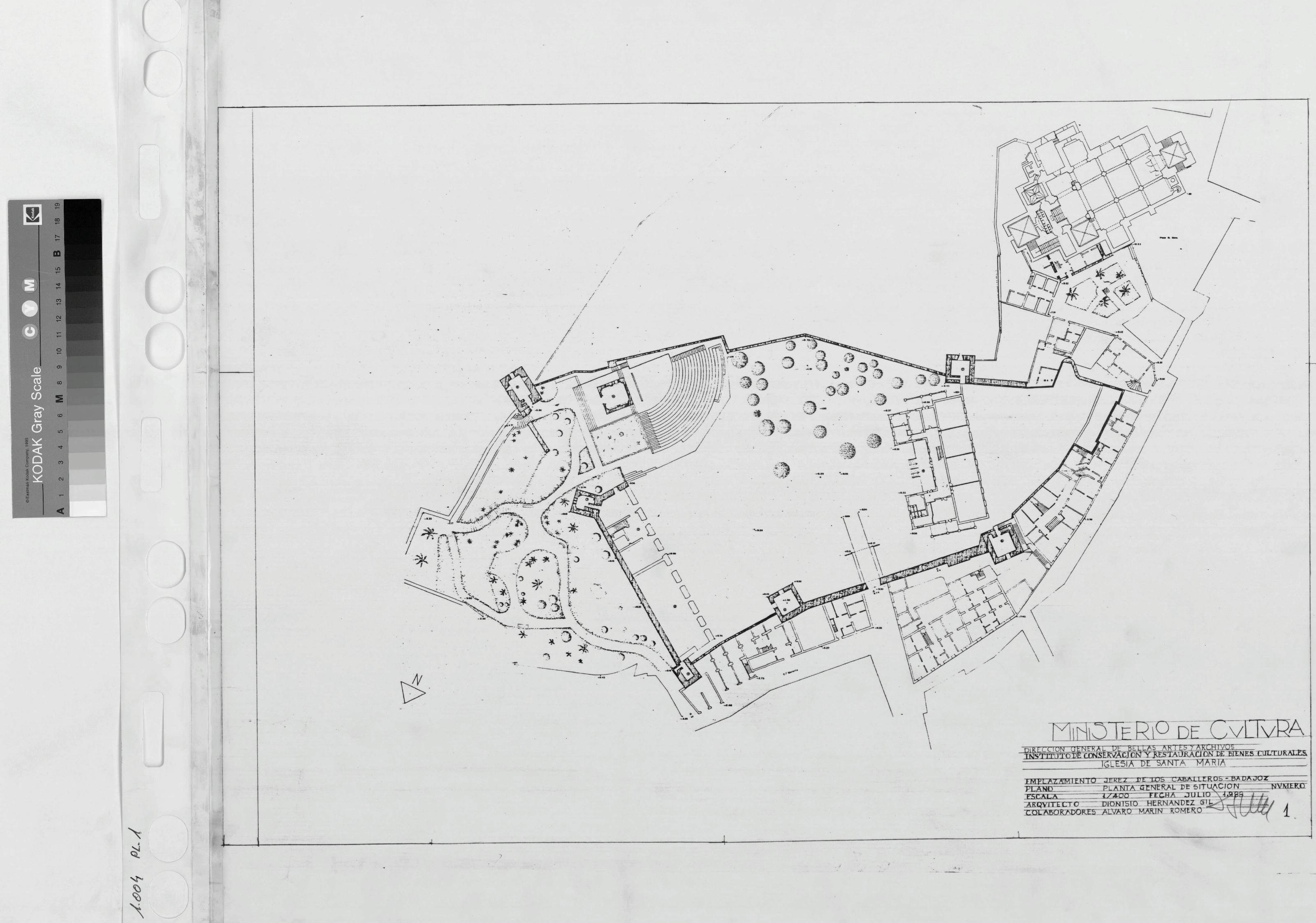 IGLESIA DE SANTA MARIA JEREZ DE LOS CABALLEROS (Badajoz): PLANTA GENERAL DE SITUACION Con corte por la Iglesia y edificaciones adyacentes dentro del solar viéndose distribución de estancias y jardines. Con cotas de nivel en diferentes puntos. Firmado