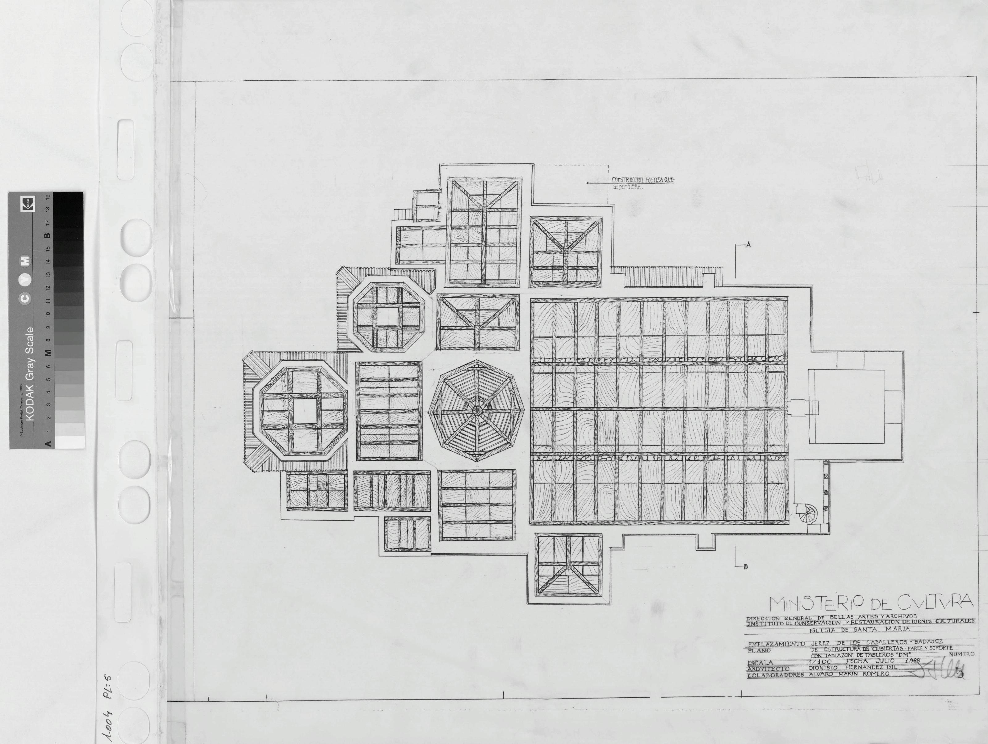 IGLESIA DE SANTA MARIA JEREZ DE LOS CABALLEROS (Badajoz): ESTRUCTURA DE CUBIERTAS, PARES Y SOPORTE CON TABLAZÓN DE TABLEROS DE "DM" Con tratamiento de rayados a mano representando madera en toda la estructura de bóveda en cada estancia. Marca una construción postiza a demoler y una linea de sección. Firmado.