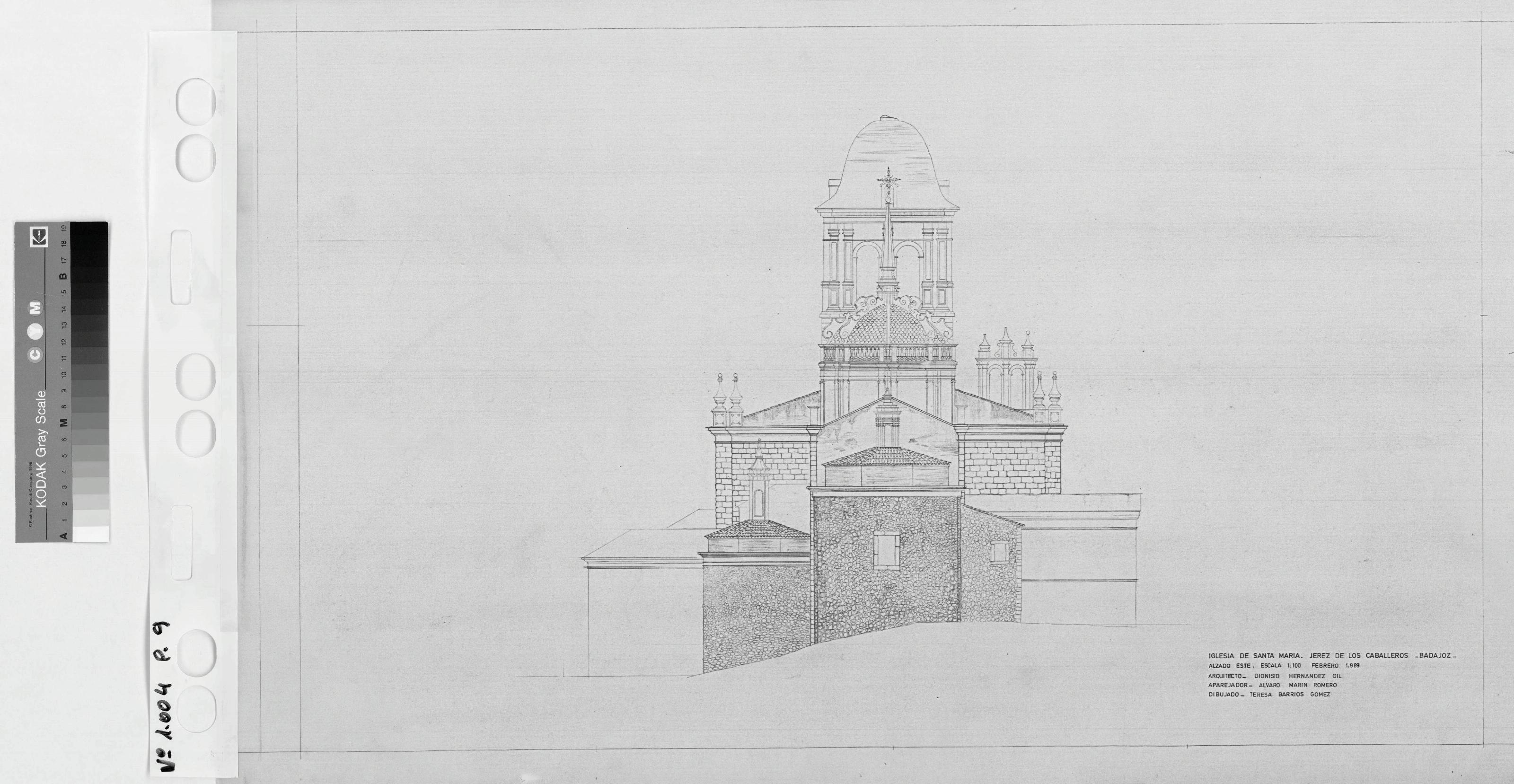 IGLESIA DE SANTA MARIA JEREZ DE LOS CABALLEROS (Badajoz): ALZADO ESTE Con tratamiento a lápiz de desperfectos y despieces.