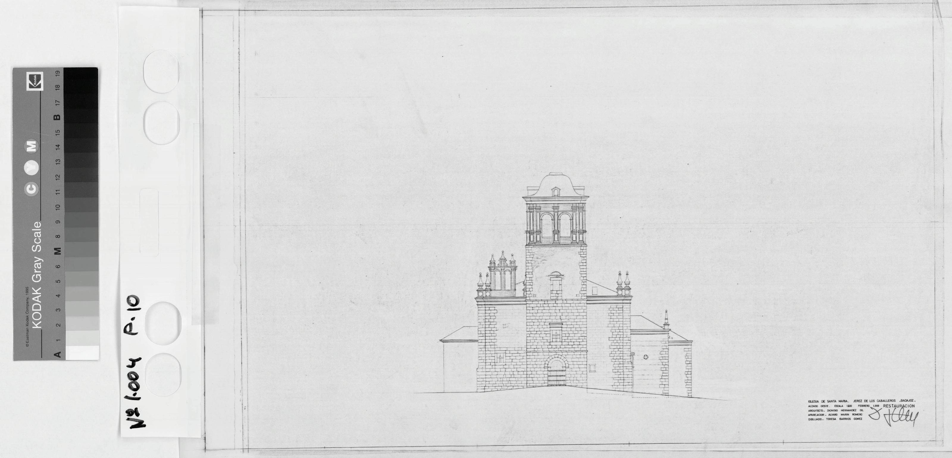IGLESIA DE SANTA MARIA JEREZ DE LOS CABALLEROS (Badajoz): ALZADO OESTE - RESTAURACIÓN Con zonas sombreadas y despieces. Firmado