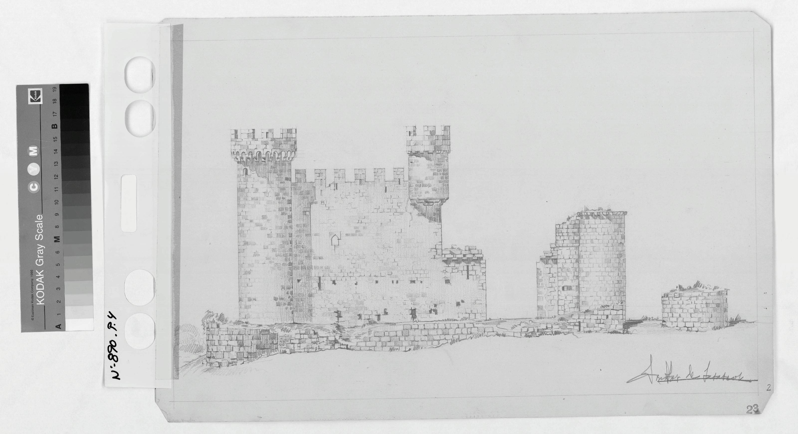 CASTILLO DE OLMILLOS DE SASAMON.- BURGOS -: ALZADO 2. Alzado dibujado a lapiz, con sombras y despiece de piedras, sin cotas ni escala.