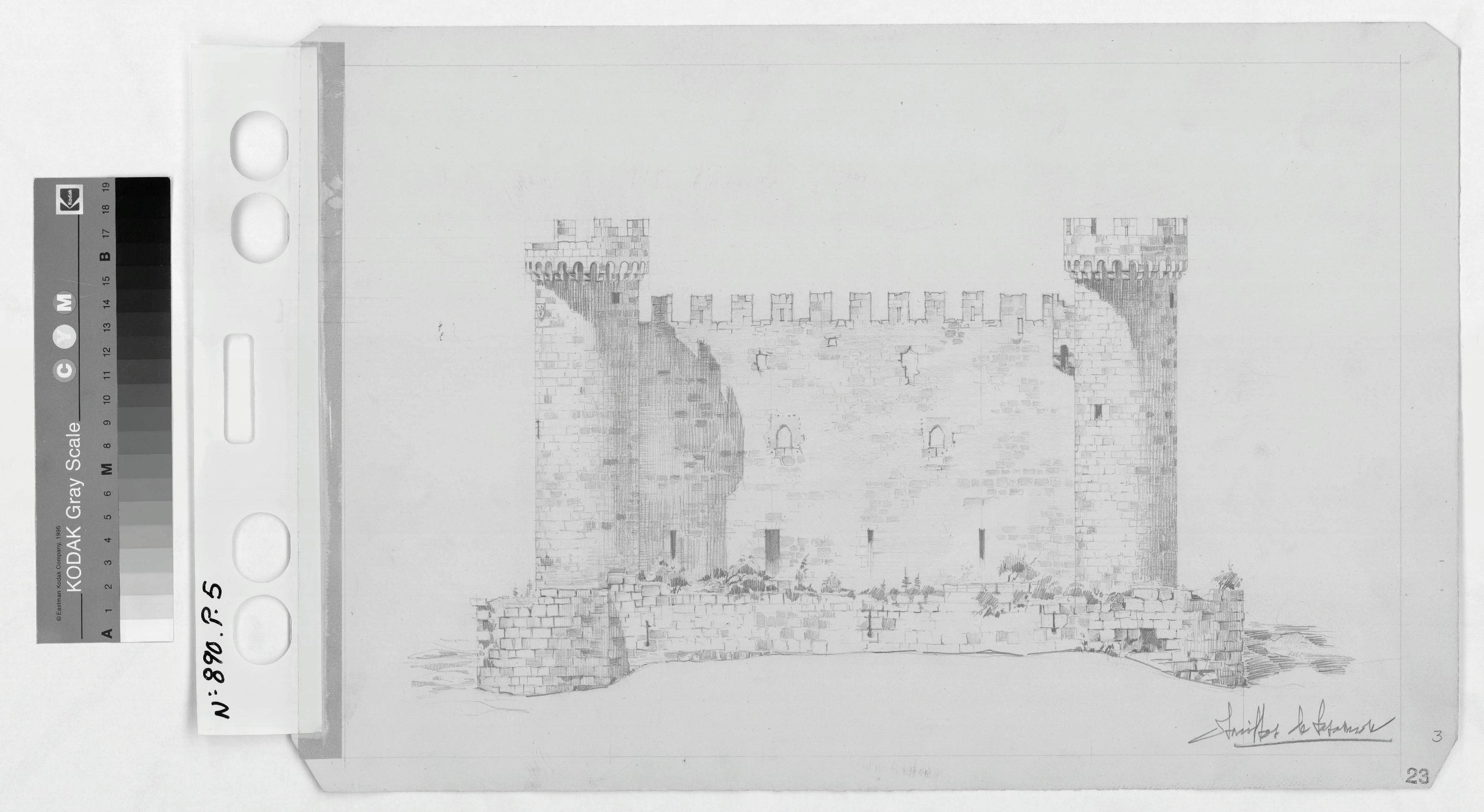 CASTILLO DE OLMILLOS DE SASAMON.- BURGOS -: ALZADO 3. Alzado dibujado a lapiz, con sombras y despiece de piedras, sin cotas ni escala.
