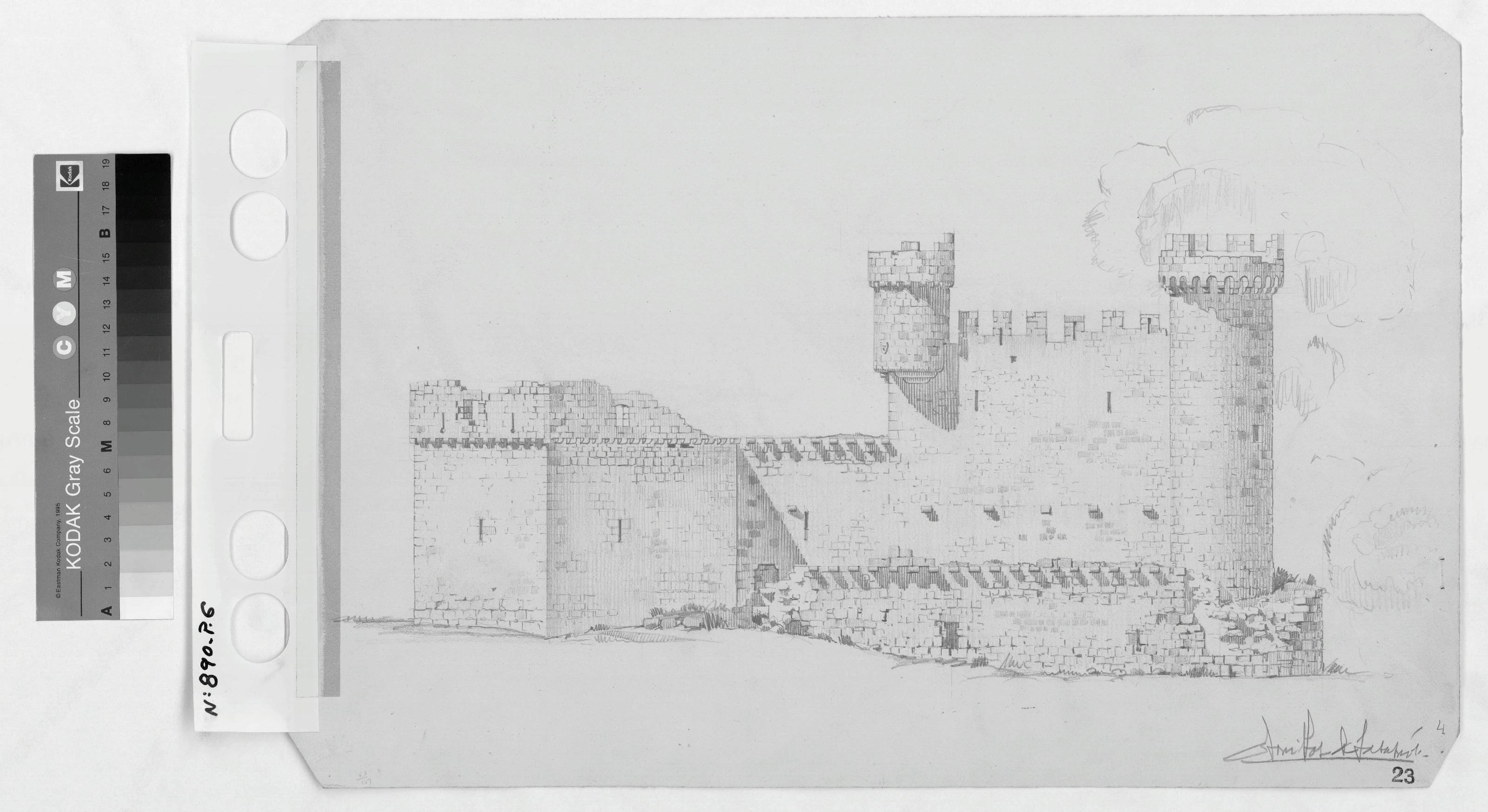 CASTILLO DE OLMILLOS DE SASAMON.- BURGOS -: ALZADO 4. Alzado dibujado a lapiz, con sombras y despiece de piedras, sin cotas ni escala.