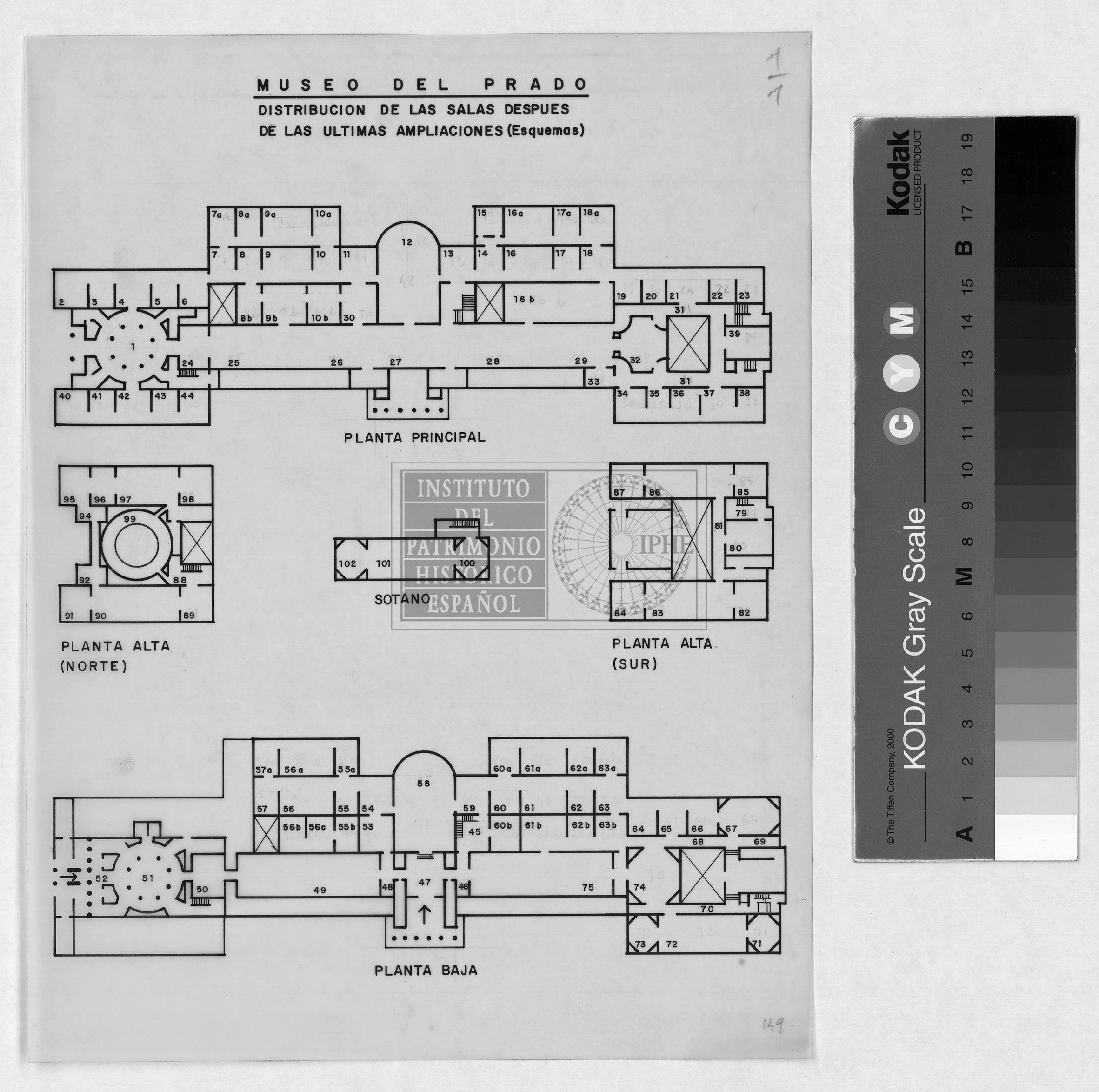 Plantas del Museo del Prado.: Distribución de las salas después de las últimas ampliaciones. Planta principal, planta baja y sótano. [149] (28x21,7 cm). Procedente de la Donación José Lino Vaamonde Horcada (2001, 1ª entrega). Actualmente ubicado en Archivador 42.4. de la FIA.