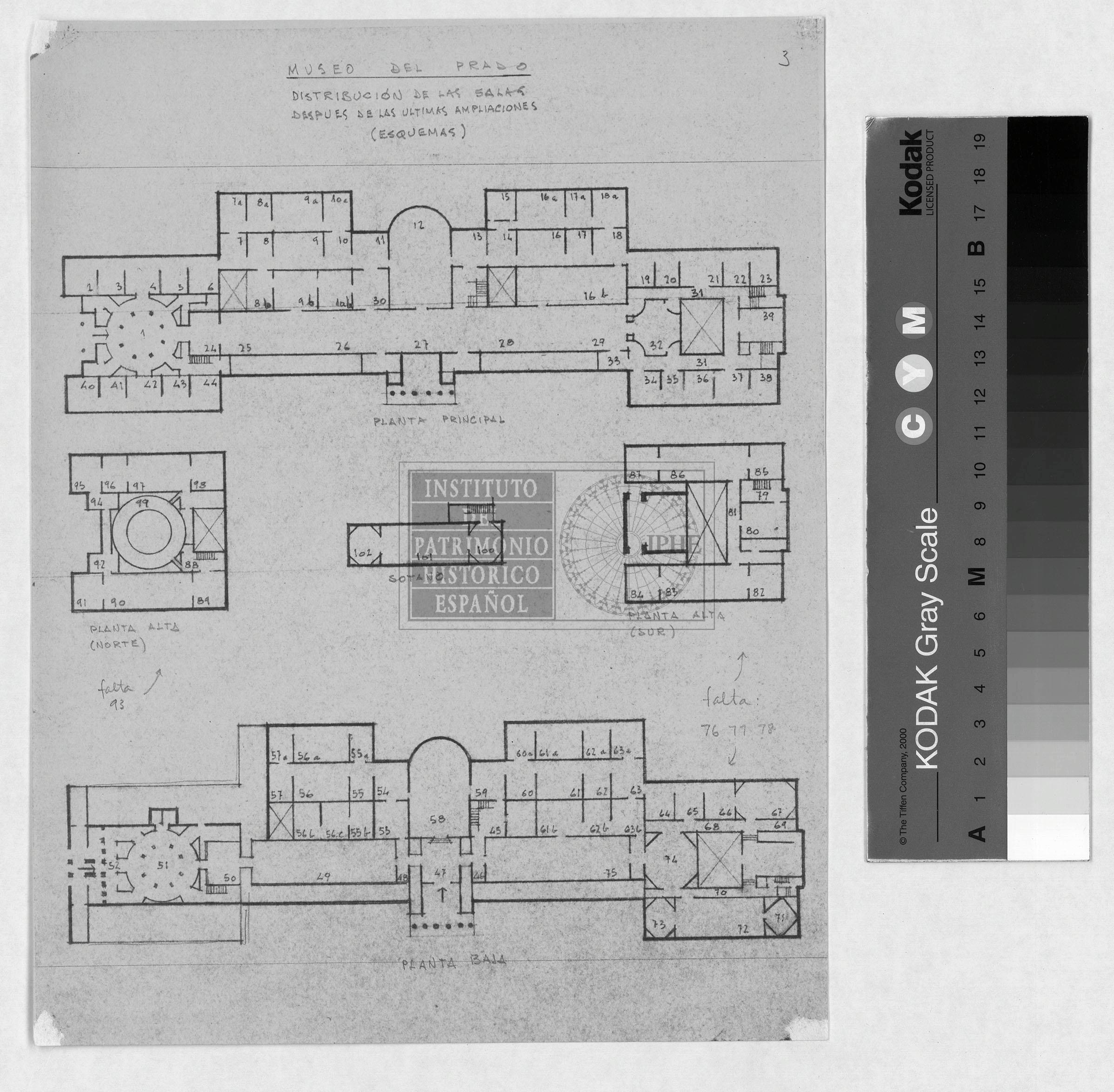 Plantas del Museo del Prado.: (Copia de tinta/papel vegetal) Distribución de las salas después de las últimas ampliaciones. Planta principal, planta baja y sótano. [149] (28x21,5 cm). Procedente de la Donación José Lino Vaamonde Horcada (2001, 1ª entrega). Actualmente ubicado en Archivador 42.4. de la FIA.
