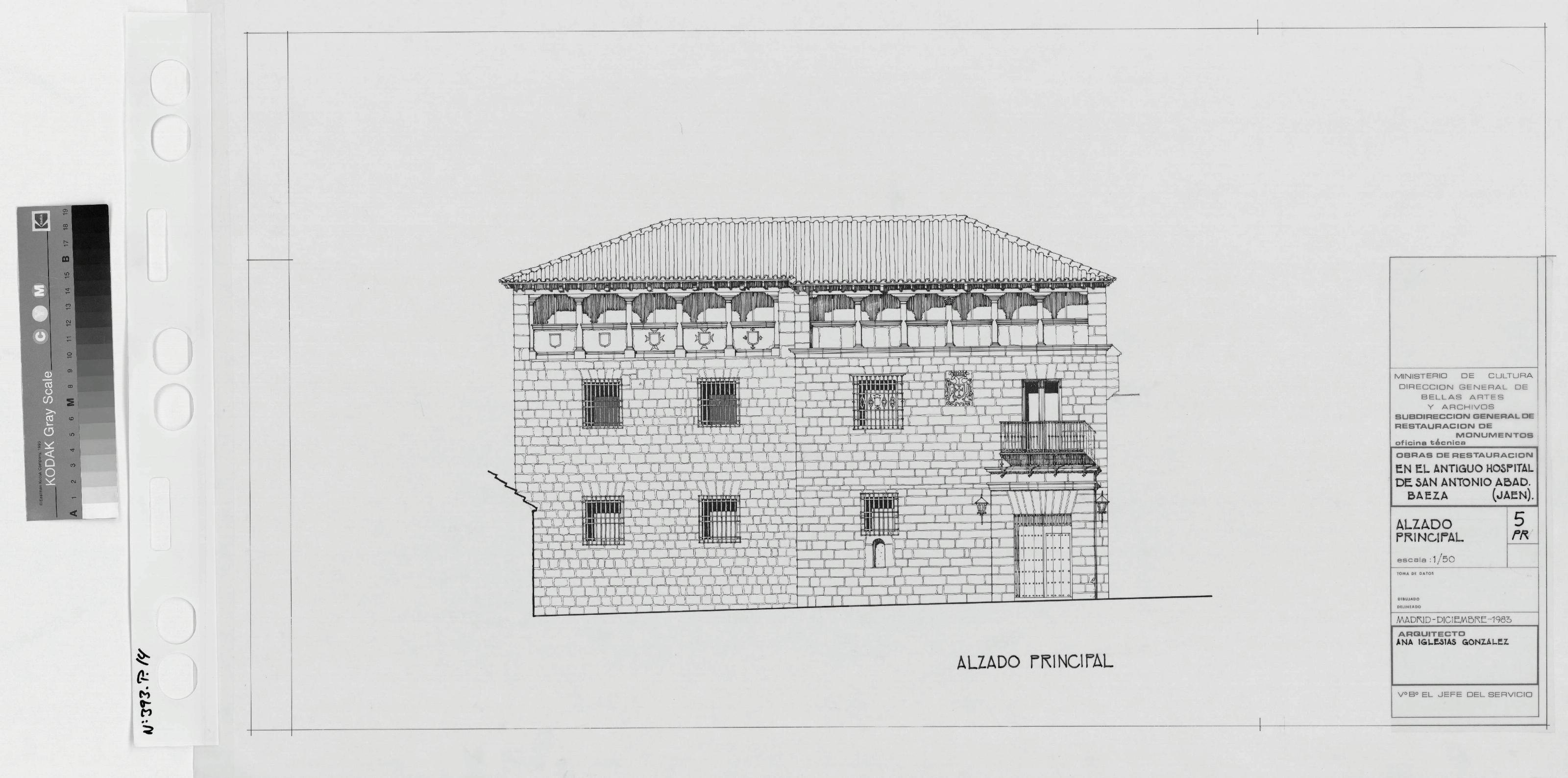 HOSPITAL DE SAN ANTONIO ABAD. BAEZA.: ALZADO PRINCIPAL. Plano dibujado con mucho detalle, sin cotas.