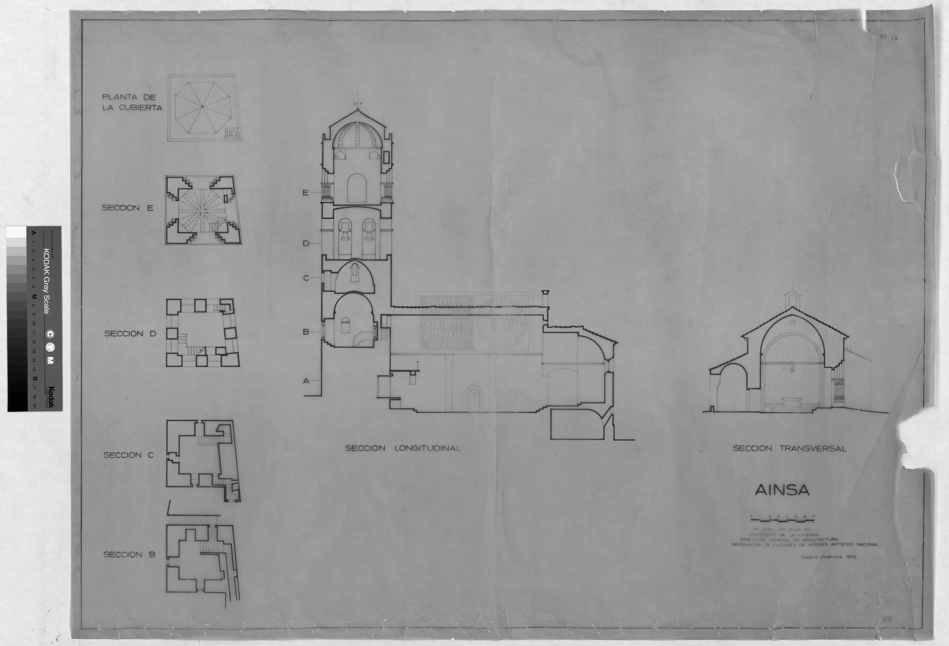 IGLESIA: PLANTA CUBIERTA SECCIONES LONGITUDINAL, TRANSVERSAL B,C,D,E.