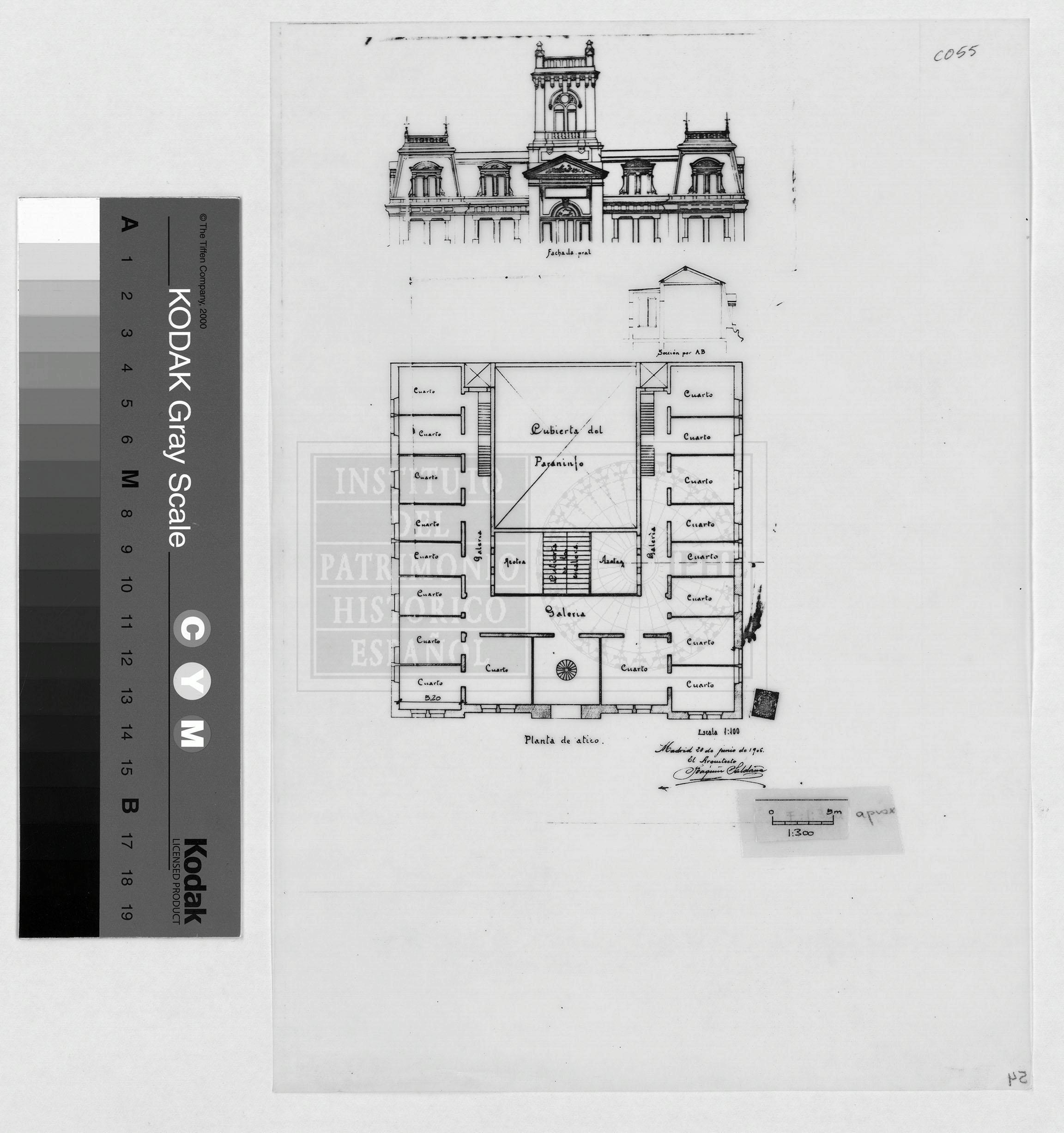 INSTITUTO DE COOPERACIÓN HISPANO AMERICANA: PLANTA DE ÁTICO Y ALZADO DE FACHADA PRINCIPAL