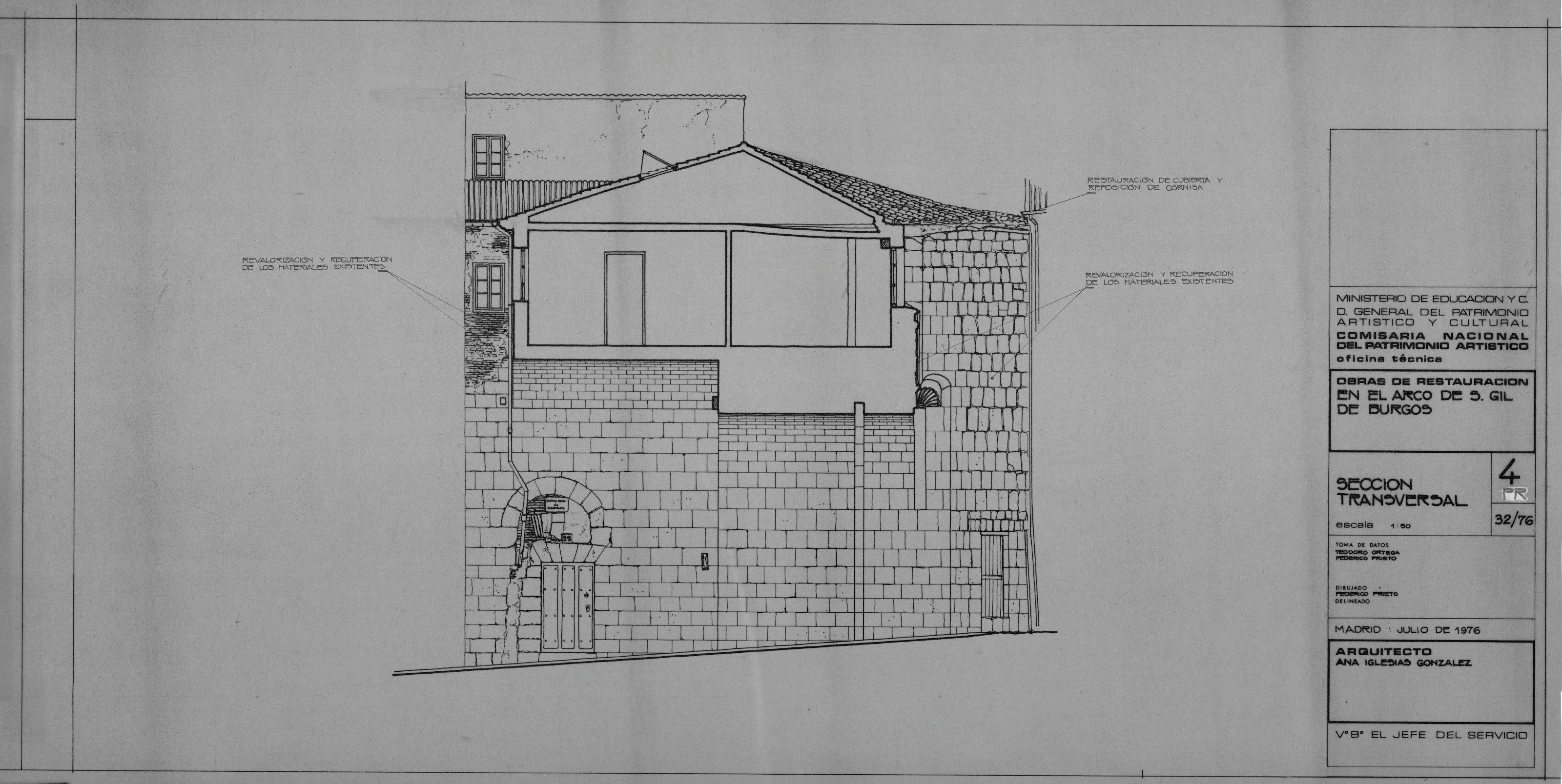 ARCO DE SAN GIL. -BURGOS-: SECCION TRANSVERSAL. En el alzado aparece una nota con la recuperacion de los materiales existentes, y la restauracion de cubierta , junto con la reposicion de la cornisa. En la seccion aparece la planta segunda de la vivienda, plano sin cotas.