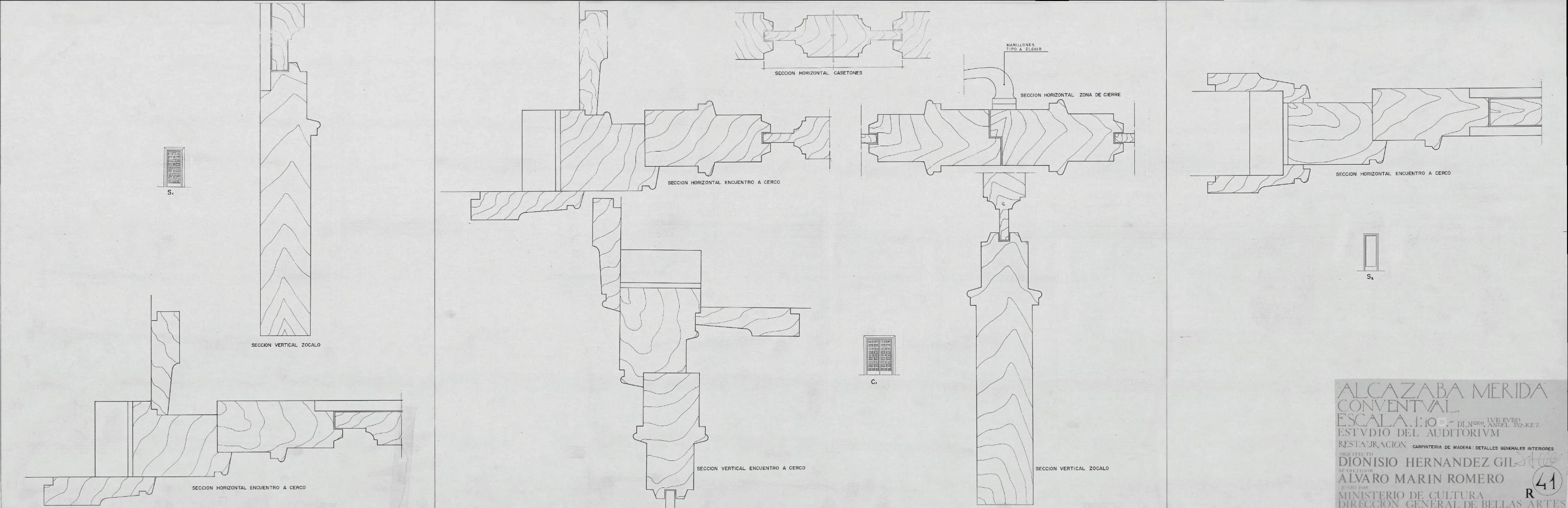 ALCAZABA DE MERIDA (Badajoz) Estudio del Auditorium: Restauración - CARPINTERIA INTERIOR DE MADERA - Detalles Generales 8 secciones - detalle referenciados a los tipos S-1, S-2 y C-1 a escala natural.