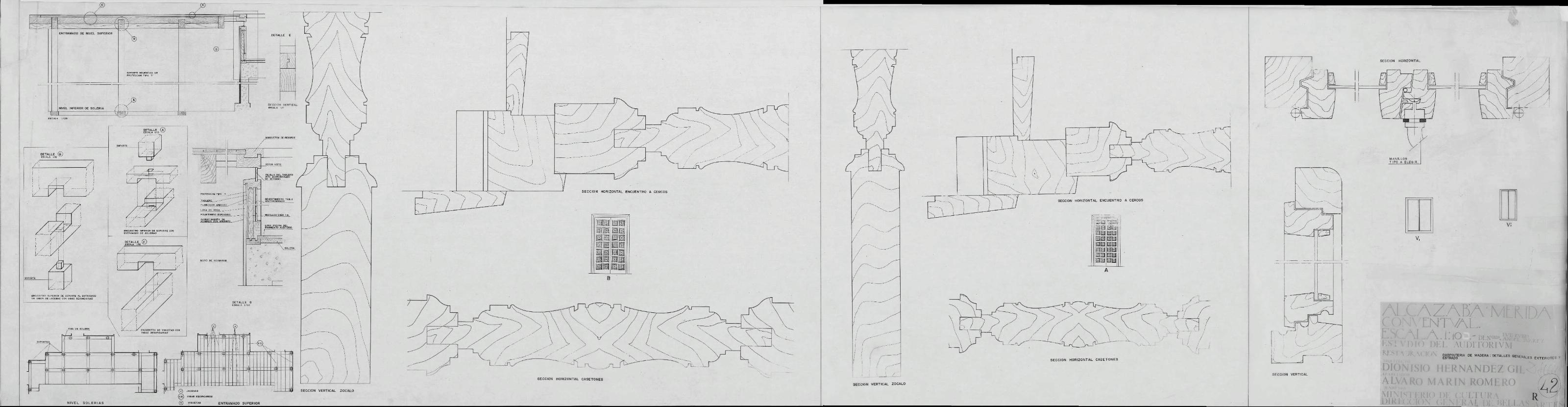 ALCAZABA DE MERIDA (Badajoz) Estudio del Auditorium: Restauración - CARPINTERIA DE MADERA - Detalles Generales Exteriores y Estrado 8 secciones - detalle referenciados a los tipos A, B y V-1 y V-1¿ a escala natural y un apartado dedicado al estrado que consta de 2 plantas dos secciones y diversos detalles en sección de ensambles