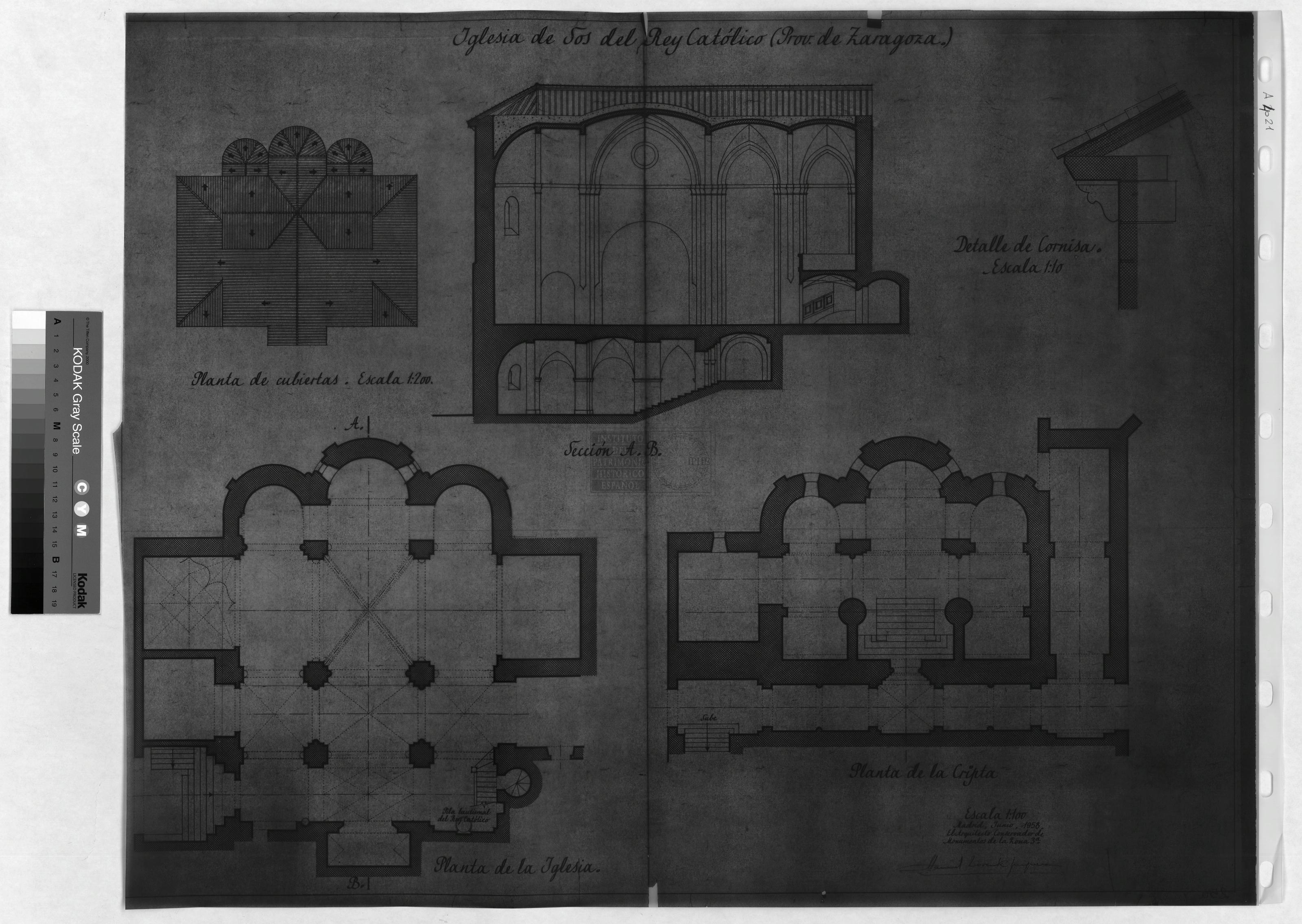 IGLESIA: PLANTA PRINCIPAL, CUBIERTAS, CRIPTA, DETALLE CORINISA, SECCION A-B