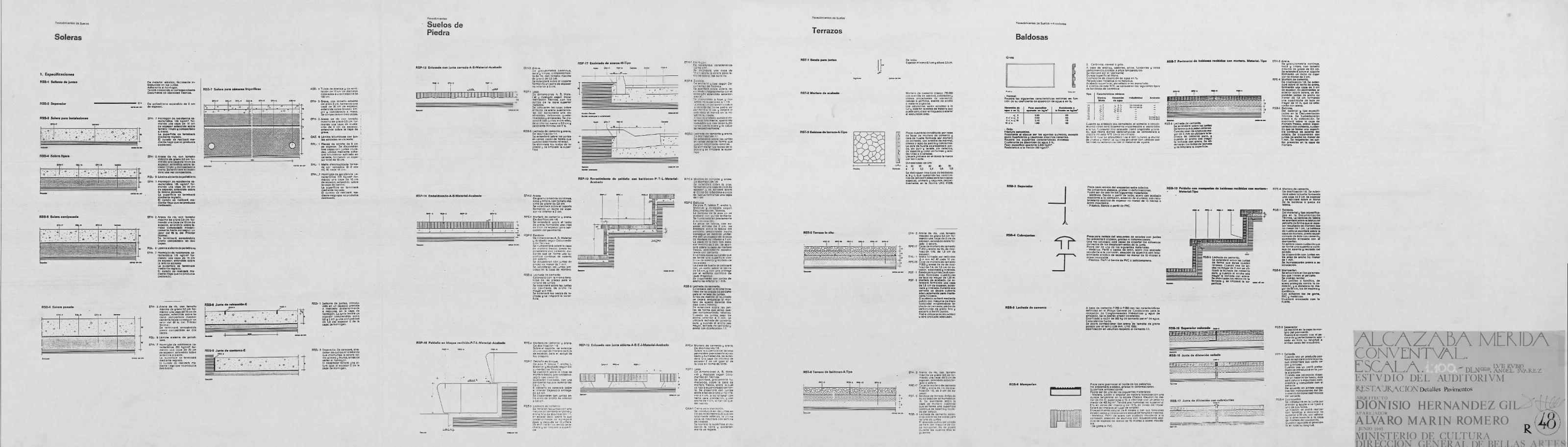 ALCAZABA DE MERIDA (Badajoz) Estudio del Auditorium: Restauración - DETALLES DE PAVIMENTOS Multitud de detalles de Soleras, suelos de piedra, Terrazos y Baldosas a diferentes escalas y con leyendas tomados de normativa. Firmado