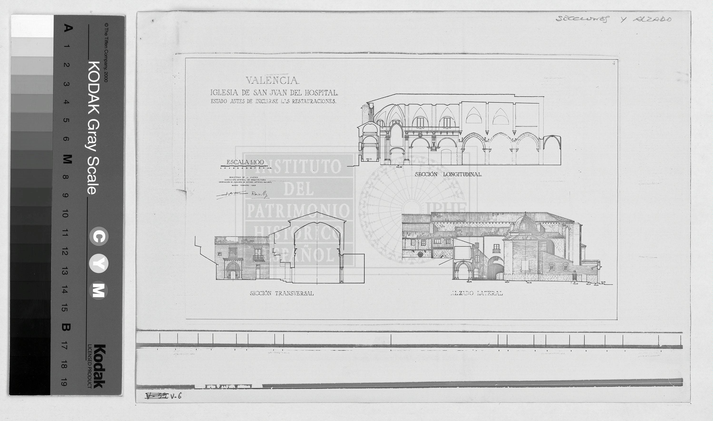 IGLESIA DE SAN JUAN DEL HOSPITAL: SECCIONES TRANSVERSAL, LONGITUDINAL, ALZADO LATERAL