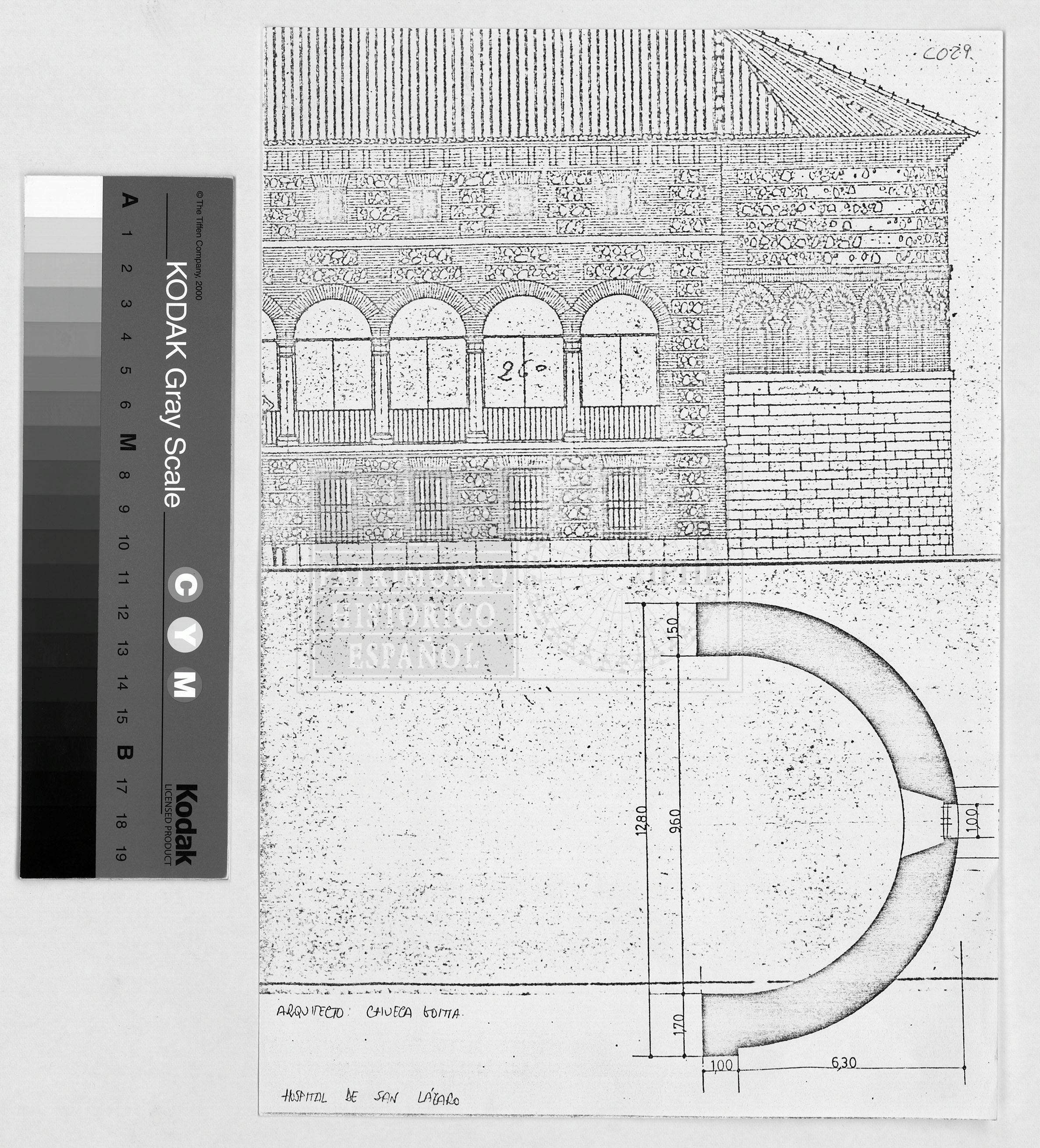 HOSPITAL DE SAN LÁZARO: ARCO APAINELADO CON COTAS Y ALZADO FACHADA